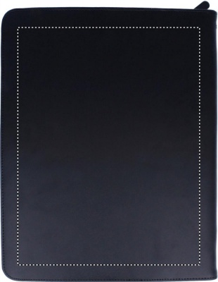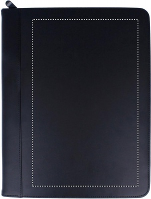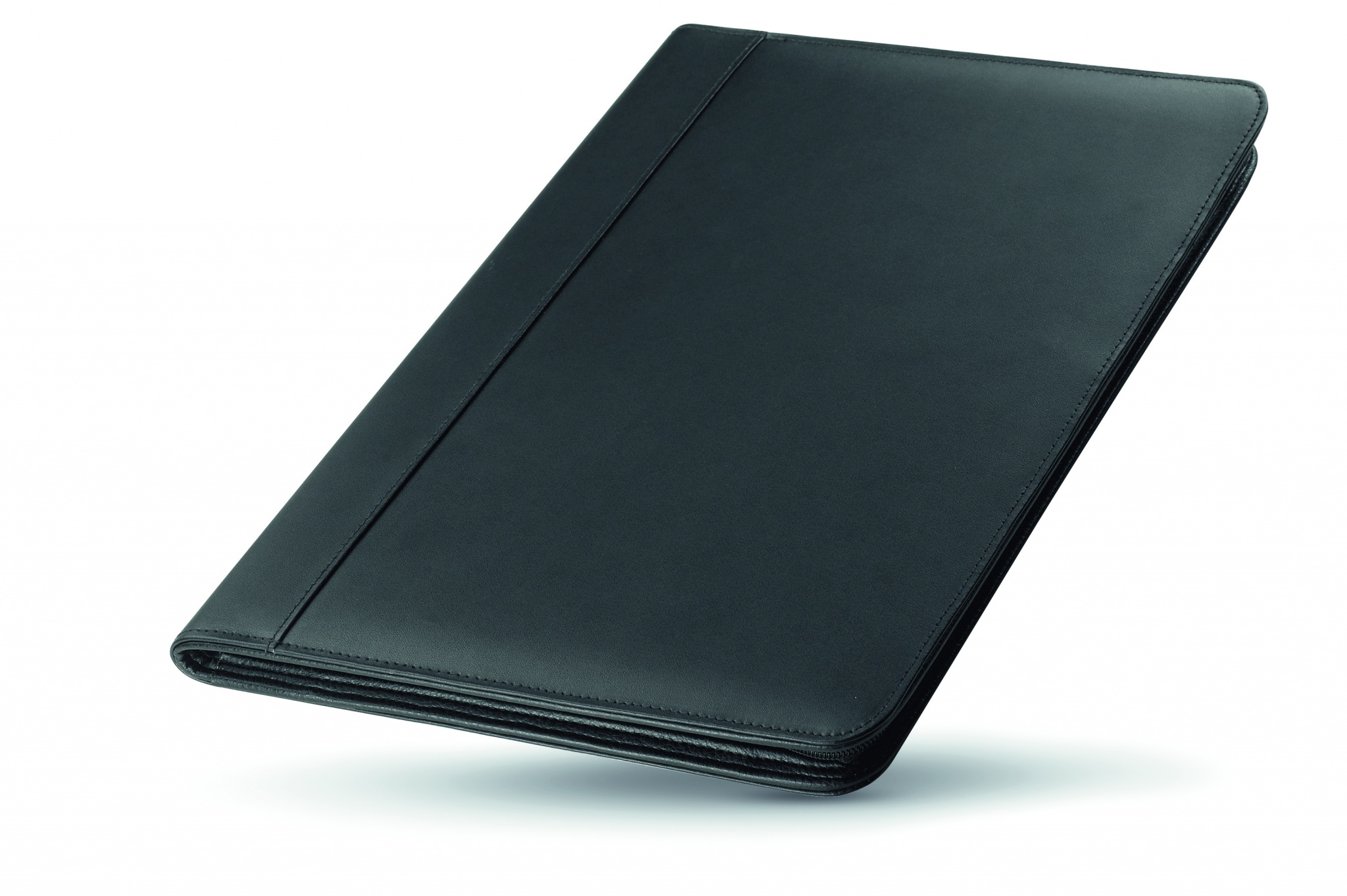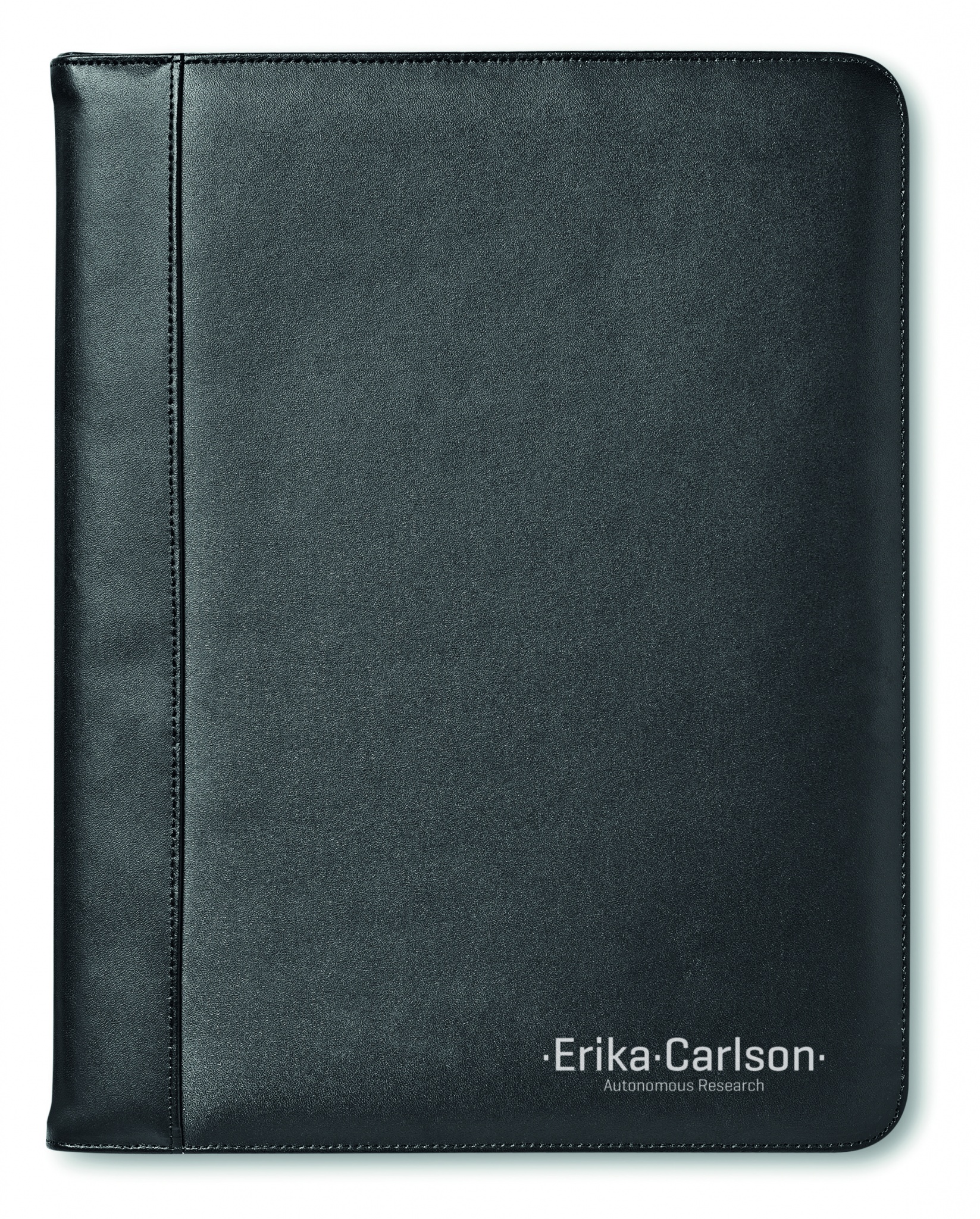 A4 kansio vetoketjulla, nahkapäällisellä ja PU-pohjalla. Sisältää 25 sivuisen muistilehtiön.