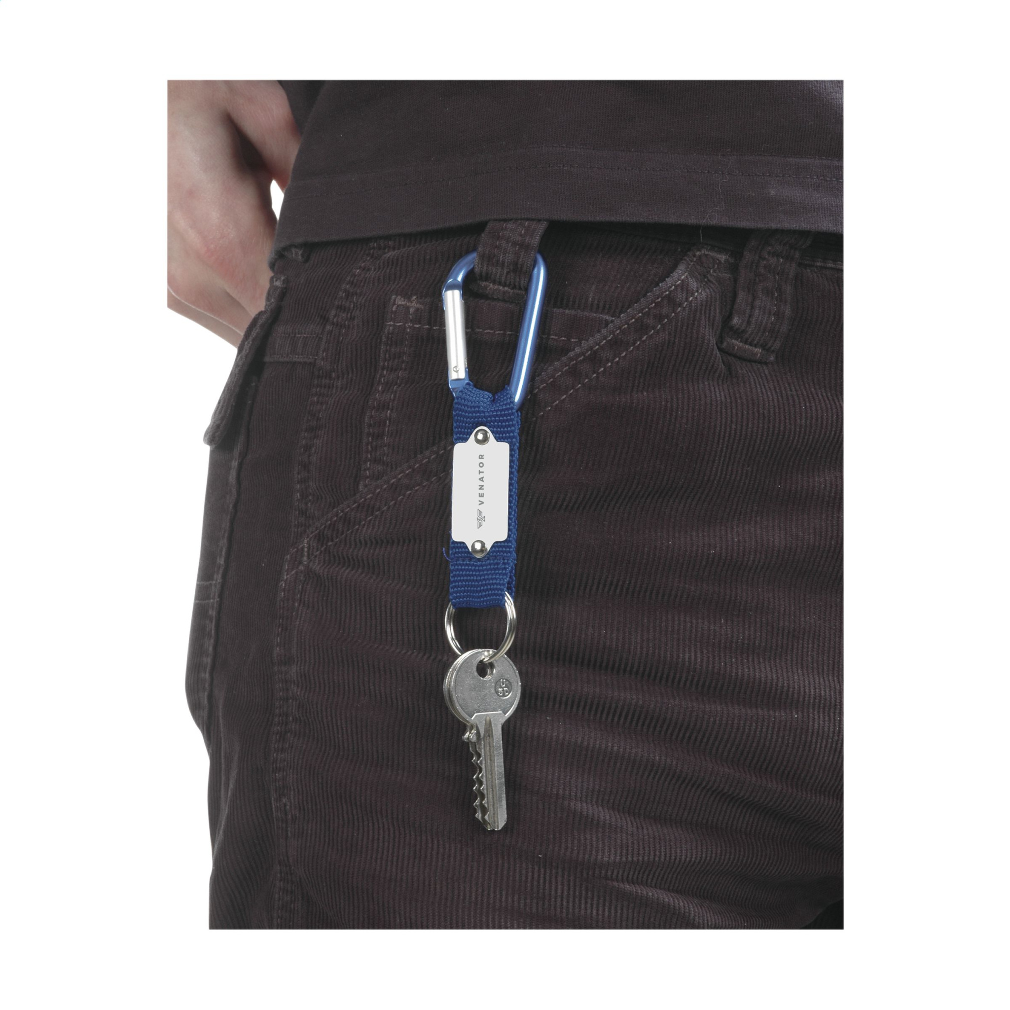 Karabiinikoukku kudotulla nylonhihnalla ja tukevalla avaimenperällä.