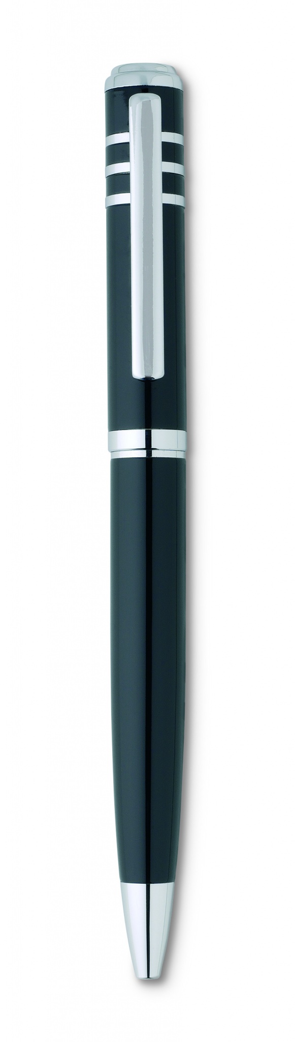 Metallinen kuulakärkikynä kiertomekanismilla, kiiltävällä lakkapinnoitteella lahjapakkauksessa. Musta muste.