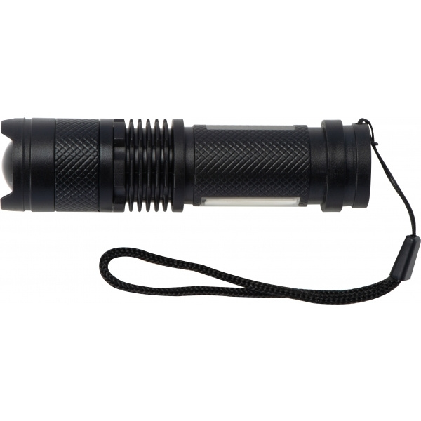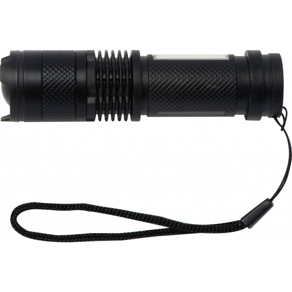 Ladattava muovinen COB-taskulamppu, jossa on kaksi eri valotilaa (normaali ja vilkkuva) sekä säädettävä tarkennus ja toinen lamppu kahvassa. Sisältää latauskaapeli (USB-USB-C-portti).