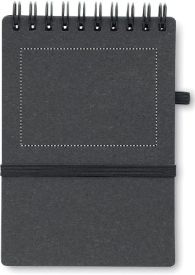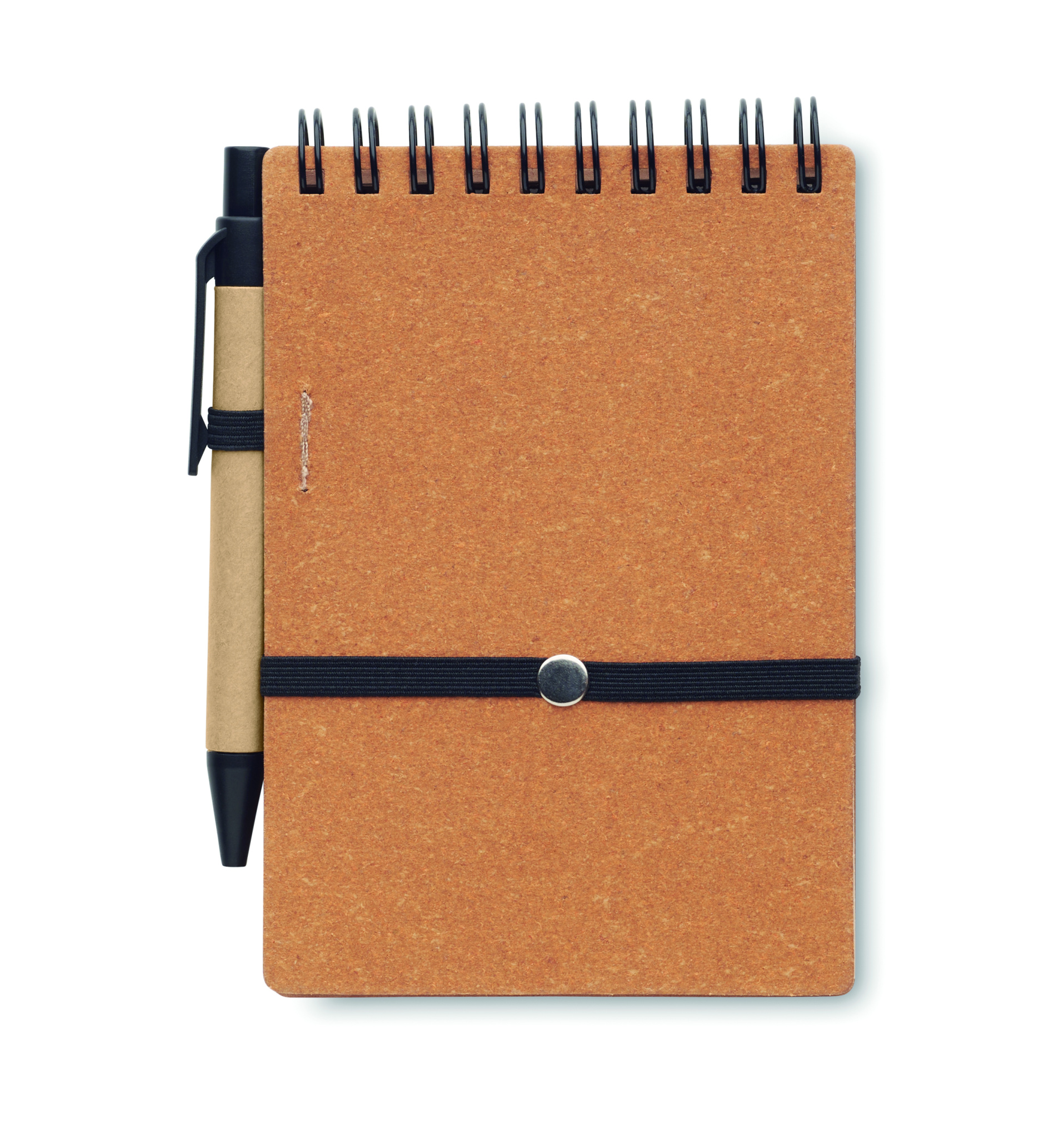 Muistikirja, jossa kierrätyspaperi- ja PU-kansi (70 % kierrätyspaperia, 30 % PU). Koko 9x13 cm. Kaksoiskierresidonta (twin-wire), 140 viivoitettua sivua (70 arkkia), valmistettu kierrätyspaperista. Mukana yhteensopiva kuulakärkikynä, joka on valmistettu kierrätyspaperista ja ABS-muoviosista. Sininen muste. Kynä on helppo säilyttää kynänpidikkeessä.