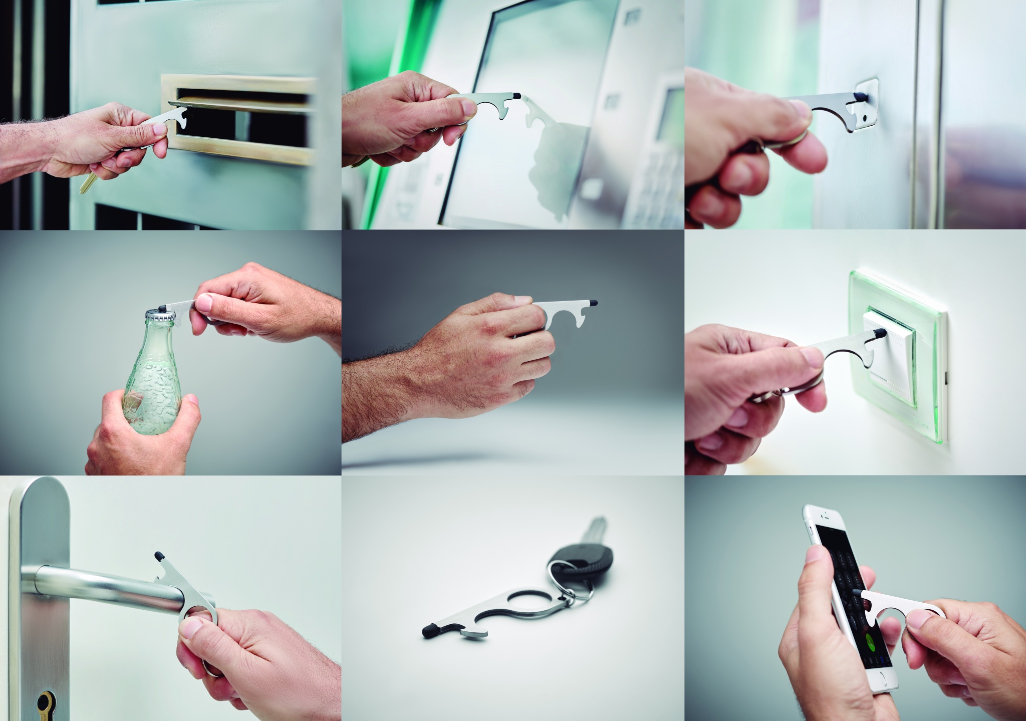 Monikäyttöinen 5-1 kosketusvapaa avaimenperä. Avaa ovet, paina erillaisia nappeja ja puhelinta koskematta. Tuotteessa pullonavaaja, kosketusnäyttöpää ja avainlenkki.