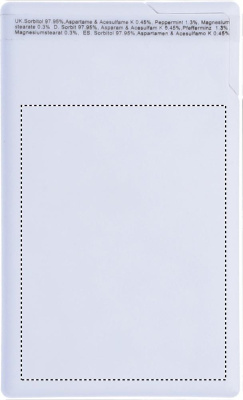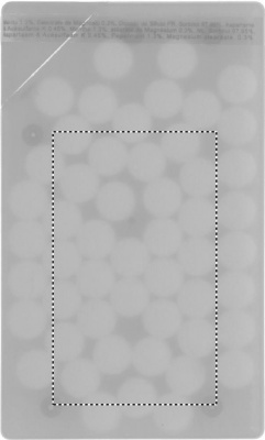 Pastillien annostelija luottokortin muodossa, sisältää 8 grammaa pastilleja.