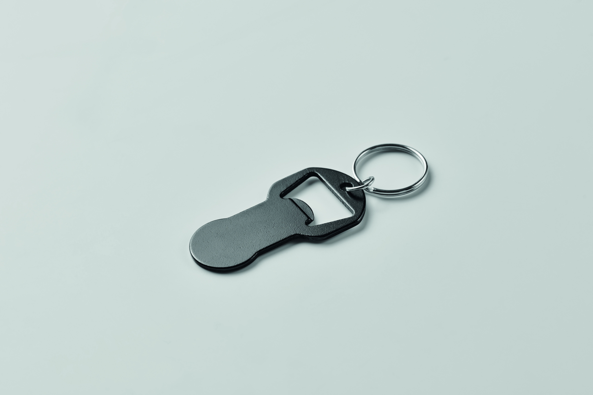 Kierrätetystä alumiinista valmistettu pullonavaaja-avaimenperä, jossa on rautarengas.