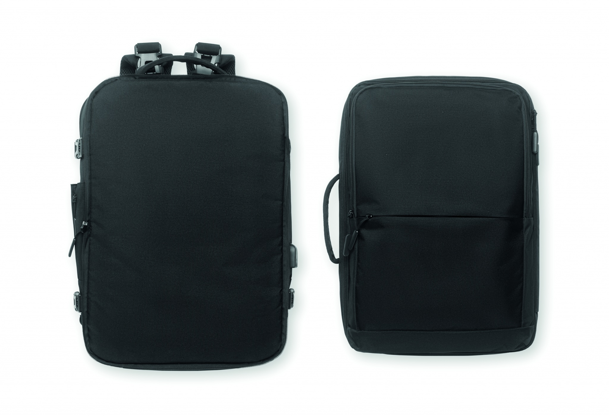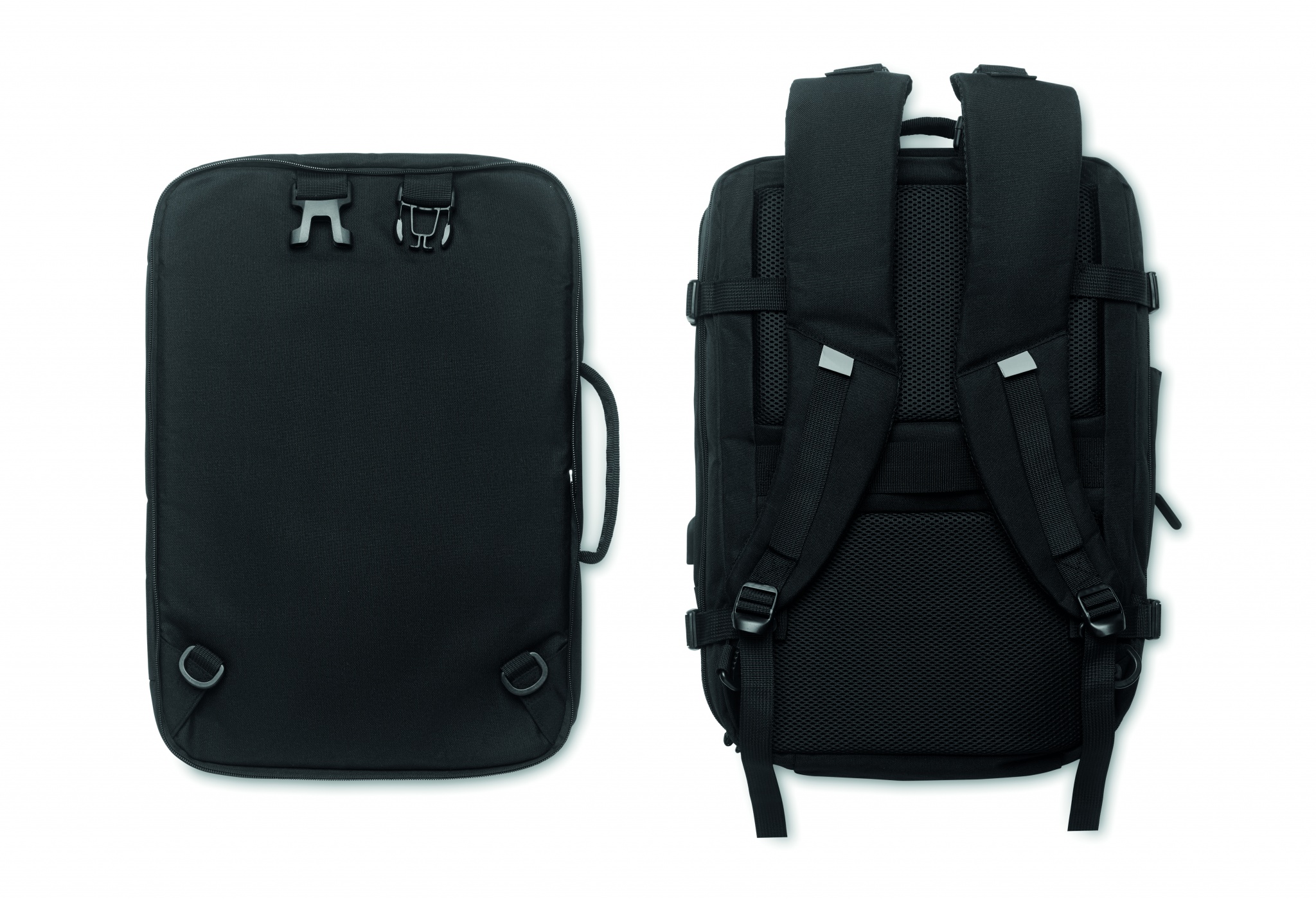 Travel Tech -reppu 600D RPET-polyesteriä. Repussa on useita lokeroita ja taskuja.