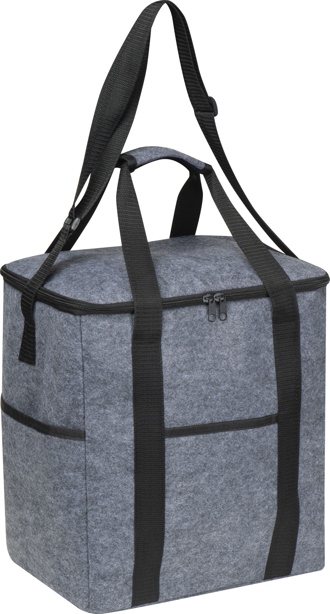 Erittäin suuri kierrätyshuovasta valmistettu kylmälaukku. Siinä on suuri päälokero, kolme ulkoista taskua, kaksi kantokahvaa ja säädettävä olkahihna.