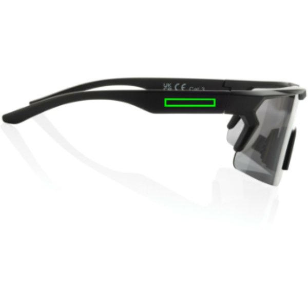 Urheilumuotoilun polarisoidut aurinkolasit, jotka on valmistettu RCS-sertifioidusta kierrätetystä PC-kehyksestä. Kokonaiskierrätetty sisältö: 65 % tuotteen kokonaispainosta. RCS-sertifiointi takaa täysin sertifioidun toimitusketjun kierrätysmateriaaleille. Mukana kierrätetty RPET-holkki lasien säilytykseen .Linssit ovat polarisoidut, mikä poistaa heijastavan auringonvalon, joten ne sopivat erinomaisesti urheiluun ja ulkoiluun. Vastaa EN ISO 12312-1, UV 400 ja CAT 3 -standardia. Pakattu FSC®-lahjapakkaukseen.
