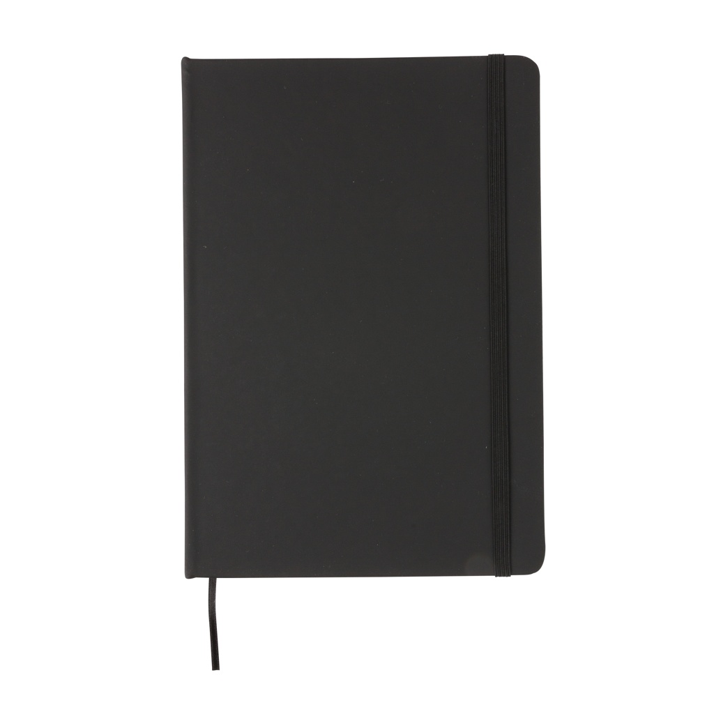 Viivoitettu kovakantinen A5-kokoinen klassinen PU-muistikirja kuminauha-sulkijalla ja mustalla nauhakirjanmerkillä. Sisällä 144 sivua, 70 g/m2. Kermanvalkoiset sivut.