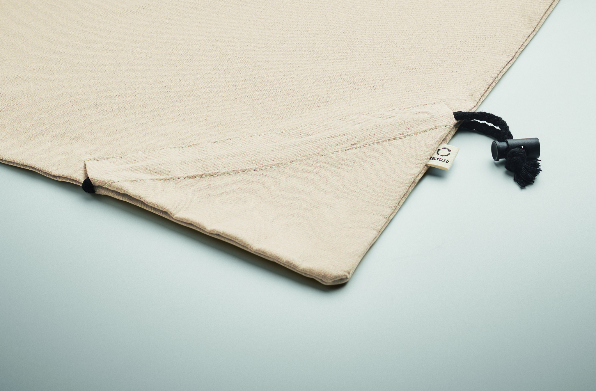 Taitettava ostoskassi (70 % kierrätettyä puuvillaa ja 30 % RPET) valmistettu kierrätetystä ennen kulutusta valmistettavista puuvillasta. 140 g/m².