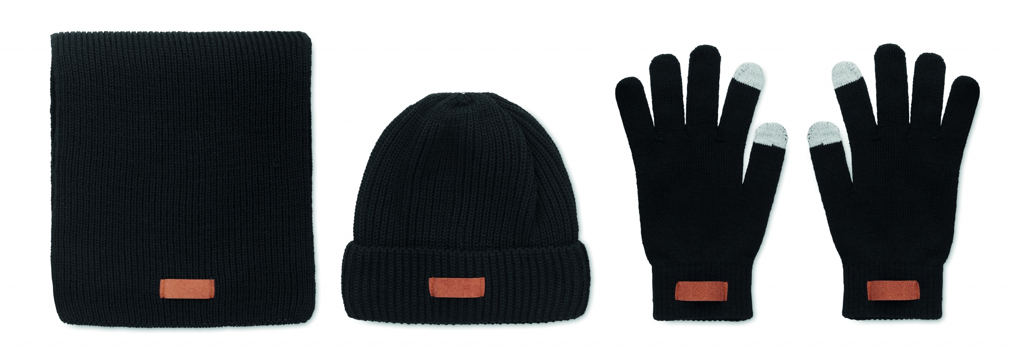3-osainen talvisetti, sisältää RPET-pipon, huivin ja kosketusnäyttö hanskat. Tuotteessa etiketti painatusaluetta varten.