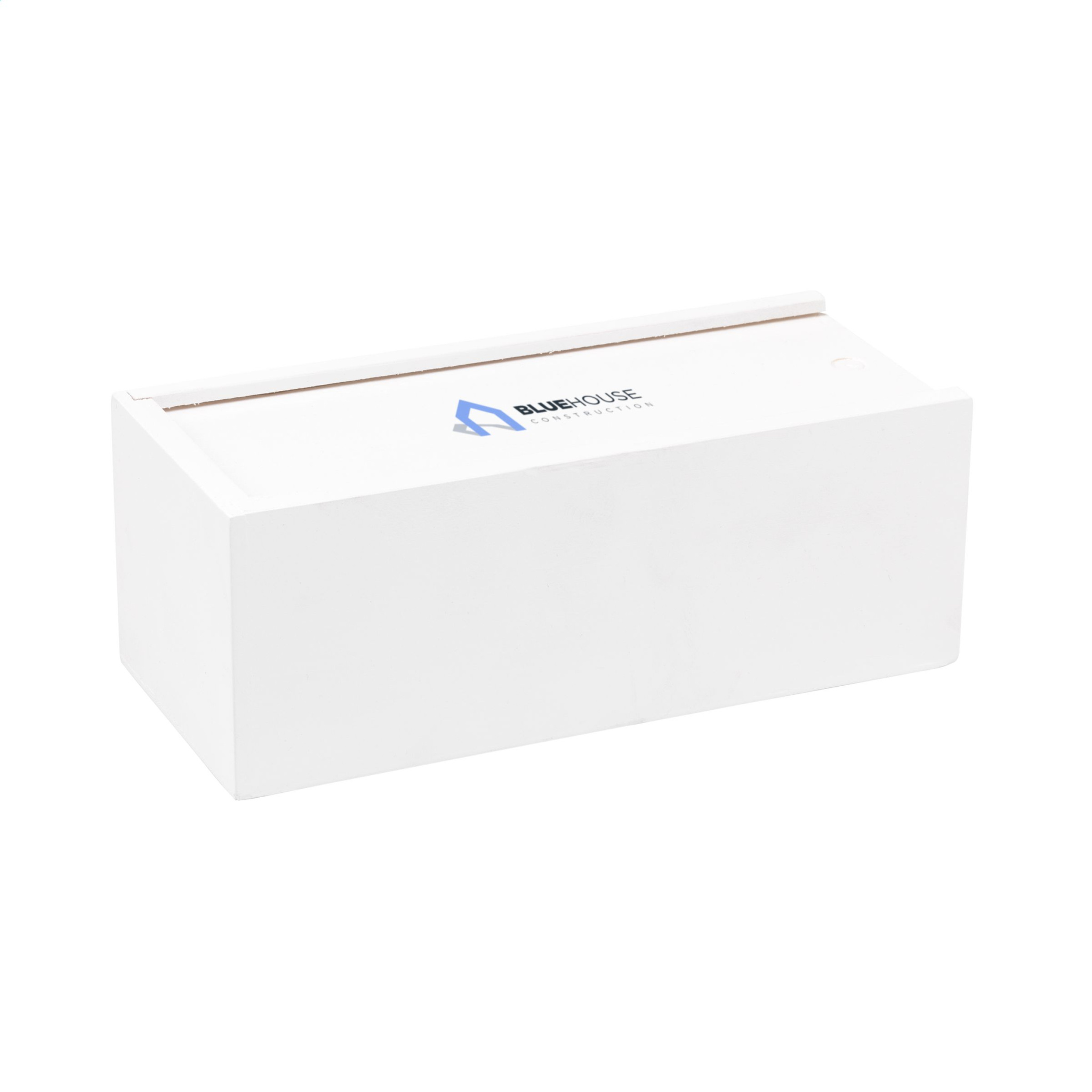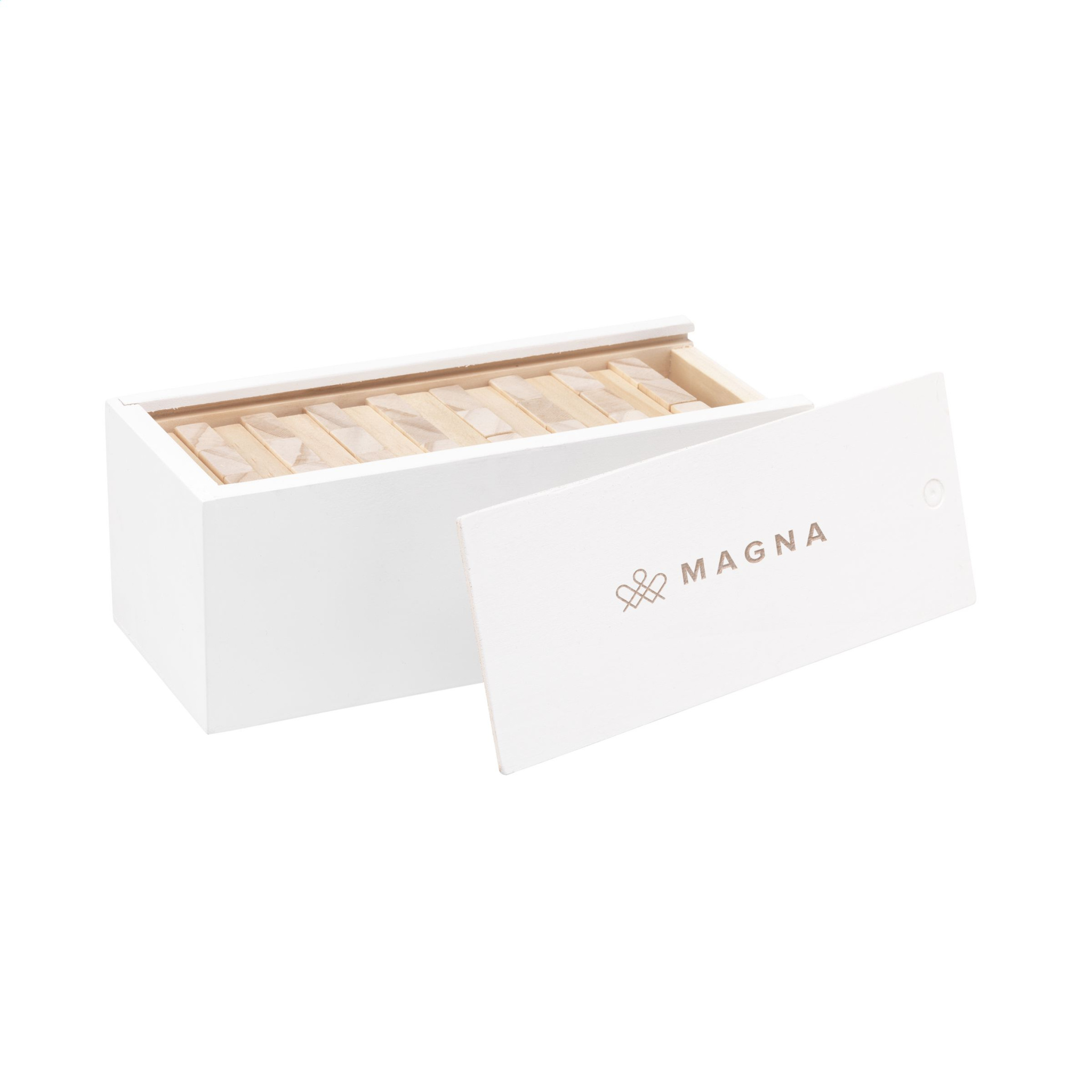 Puinen pinoamispeli (48 palikkaa). Tornin mitat 16,5 x 6 x 6 cm. Mukana valkoinen puinen laatikko, jossa on liukuva aukko säilytystä varten. Sisältää ohjeet. Jokainen tuote toimitetaan erillisessä ruskeassa pahvilaatikossa.