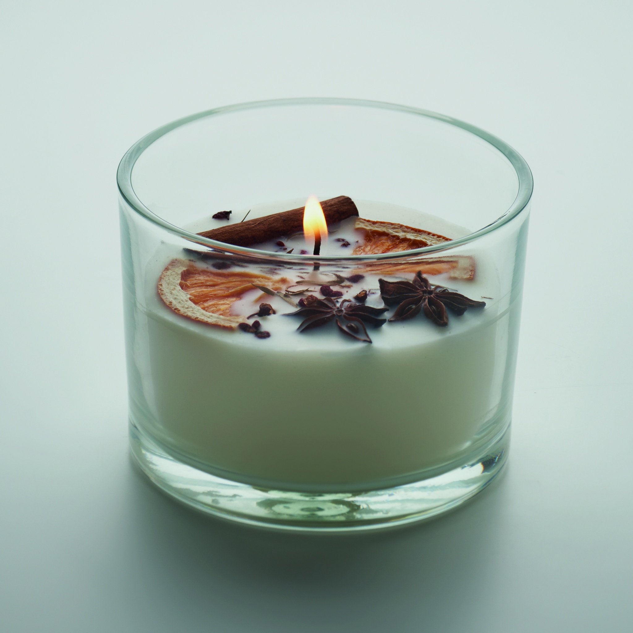 Kanelilta ja sitruksilta tuoksuva kasvipohjainen vahakynttilä, jossa on kuivattuja kukkia ja hedelmiä lasipurkissa . 300 gr. Paloaika: 50 tuntia.