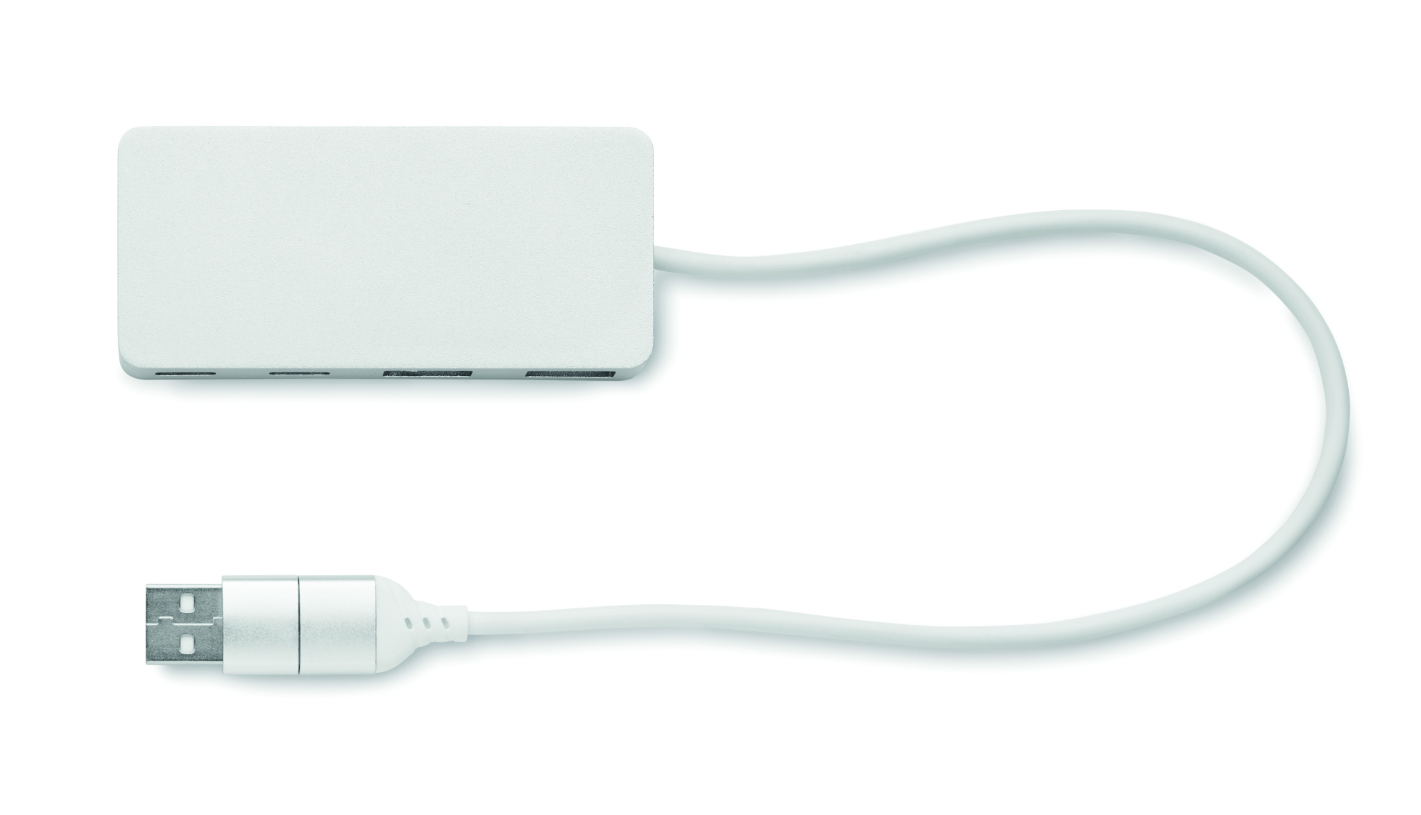 4-porttinen USB-keskitin kierrätetyssä alumiinikotelossa ja pähkinäpäällinen. Lähtö: 2 x Type-A ja 2 x Type-C. Tulo: 2-in-1 Type-C ja Type-A. Kaapelin pituus: 27,5 cm.