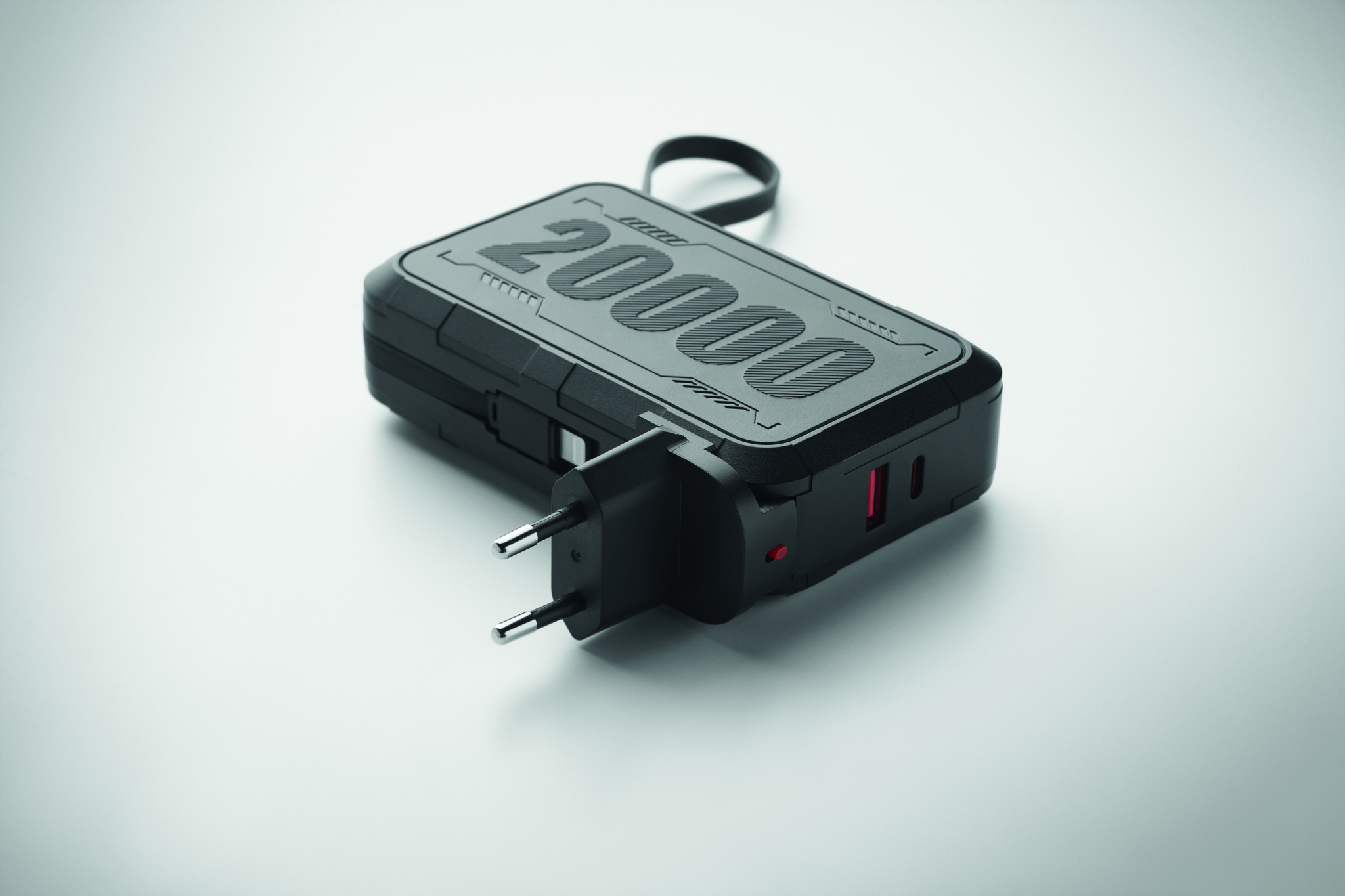20 000 mAh:n varavirtalähde ABS-muovista, jossa sisäänrakennettu US-pistoke ja irrotettava verkkovirtapistoke. USB A- ja C-tyypin sisään-/ulostulo. Integroidut C-tyypin ja 2-in-1-pinniset kaapelit.