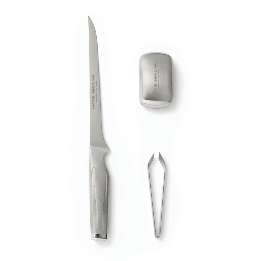 Erittäin laadukkaasta, japanilaisesta 420J-teräksestä valmistettu fileointiveitsi. Fileointiveitsessä on pitkä, kapea ja joustava terä – täydellinen tarkkaan leikkaamiseen. Voit käyttää veistä muun muassa kalan fileointiin tai kinkun vuolemiseen. Settiin sisältyy metallisaippua, joka poistaa esimerkiksi kalan ja valkosipulin hajut. Pakkaus sisältää myös pinsetit pienten ruotojen poistamiseen kalasta. Täydellinen lahja kokkauksen harrastajille.