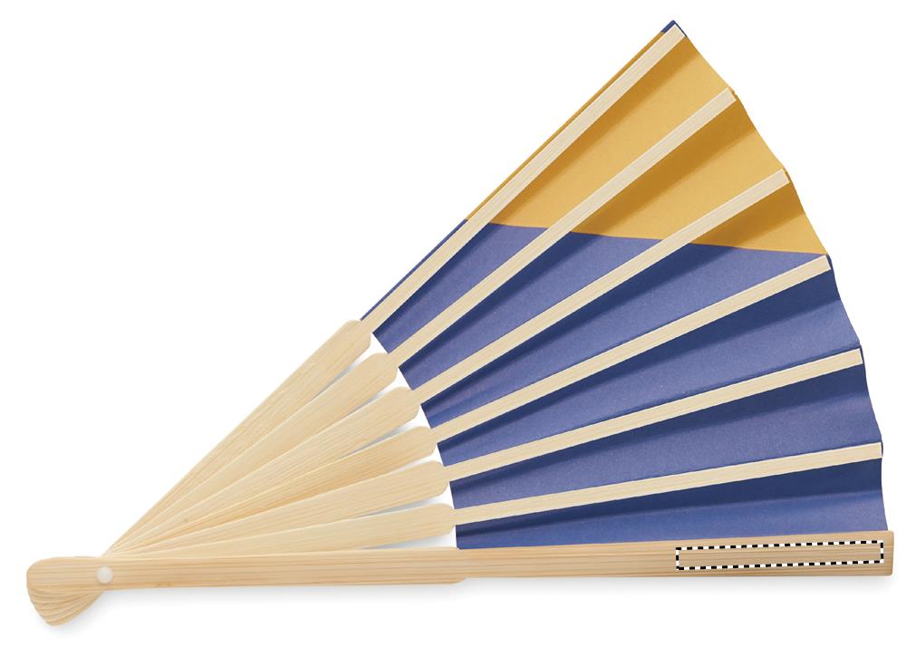 Käsikäyttöinen bambusta valmistettu viuhka, jossa on lippukuvio paperikankaalla.
