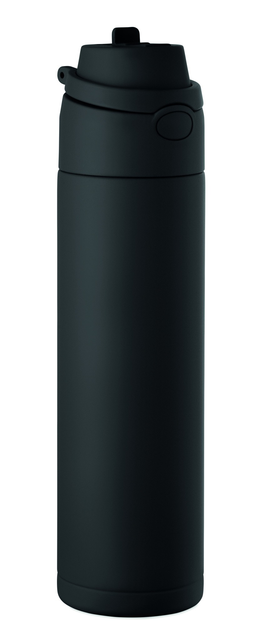 Yksiseinäinen kierrätetystä ruostumattomasta teräksestä valmistettu pullo (90 % kierrätettyä terästä ja 10 % terästä). Mukana 2-in-1-pilli ja kahvallinen PP-korkki. Vuotamaton. Tilavuus 650 ml.