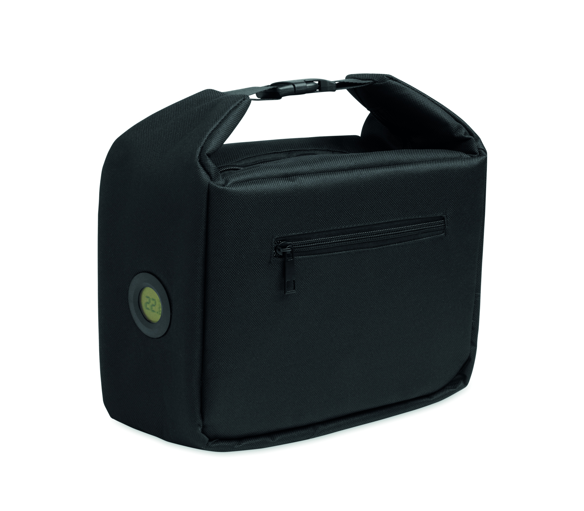 Šaldomas pietų krepšys su vidiniu temperatūros indikatoriumi, pagamintas iš 600D RPET su 3 mm PE putplasčiu ir aliuminio folijos pamušalu. Sagties užsegimas. Užtrauktuku užsegamas pagrindinis skyrius. Su šonine užtraukiama kišene. Talpa: 10 l.