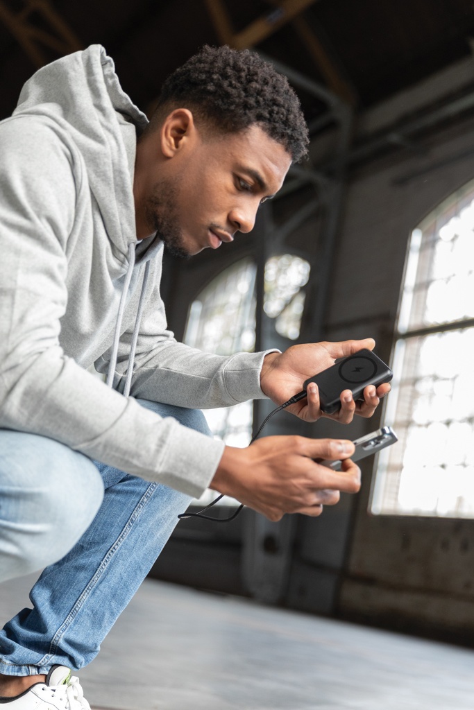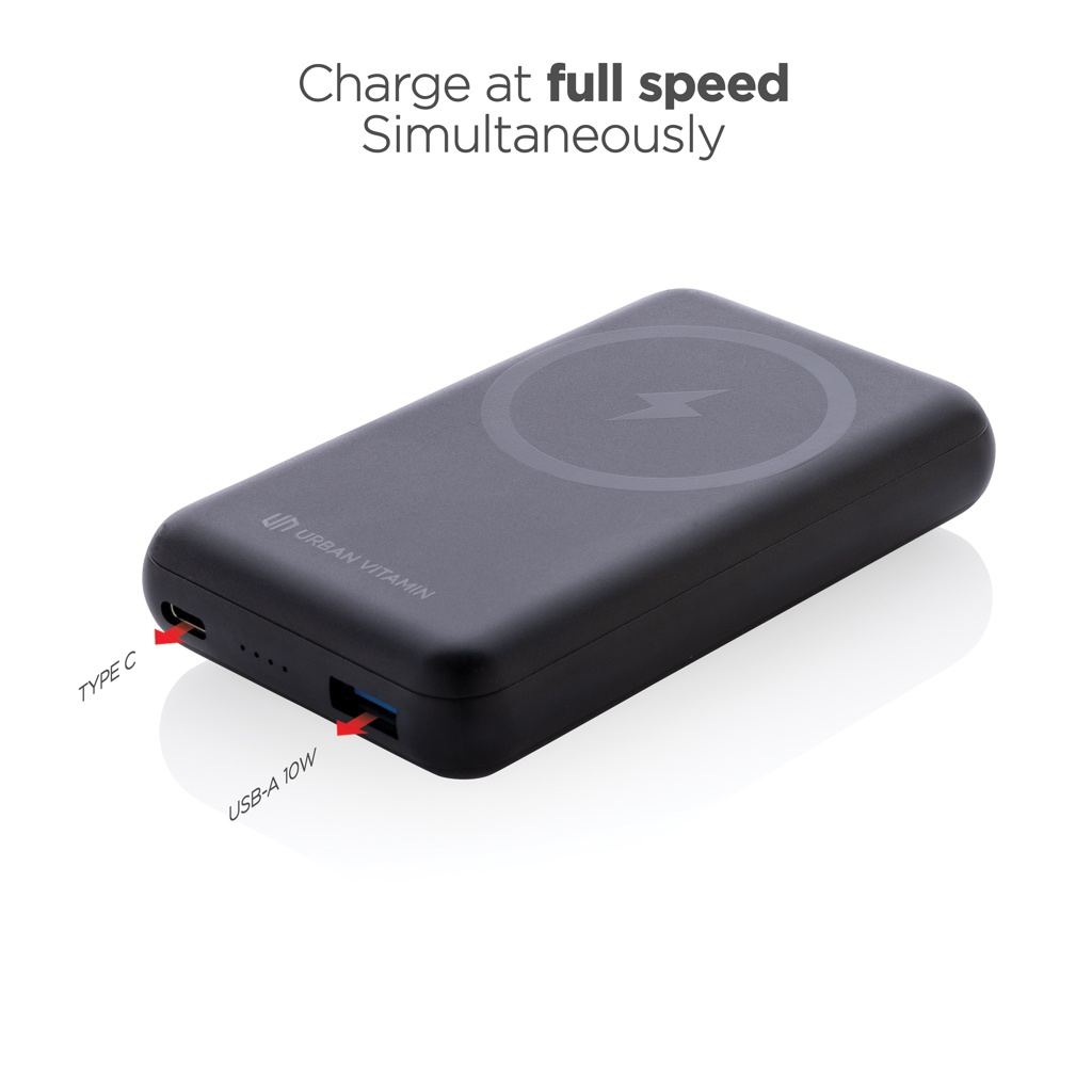 Įkraukite telefoną iki 2,5 karto naudodami šį greito įkrovimo maitinimo bloką. Plonas ir kompaktiškas maitinimo blokas turi integruotą greitą 10 W belaidį magnetinį įkroviklį. Turi universalų įmontuotą sulankstomą stovą, kuris palaiko jūsų telefoną vertikaliai, kad būtų patogus žiūrėjimo kampas. Dėl itin greito C tipo PD prievado maitinimo blokas įkraunamas rekordiškai greitai. Telefono įkrovimas iki 50% trunka tik 30 minučių. Lėtas įkrovimas yra kažkas iš praeities. Maitinimo bloke yra ilgai veikianti A klasės 10 000 mah baterija, skirta įkrauti visus įrenginius kelionėse ir nuotykiuose. Dvigubo išėjimo A ir C tipo prievadas leidžia vienu metu įkrauti iki 2 įrenginių. Pagaminta iš RCS (Recycled Claim Standard) sertifikuoto perdirbto ABS Bendras perdirbtų medžiagų kiekis: 16 % pagal bendrą prekės svorį. RCS sertifikatas užtikrina visiškai sertifikuotą perdirbtų medžiagų tiekimo grandinę. „Urban Vitamin“ gaminiai gaminami be PVC ir supakuoti į sumažintas plastikines pakuotes. USB: 5V 3.0A C tipas: 5V 3.0A, 9V 2.22A, 12V 1.5A.