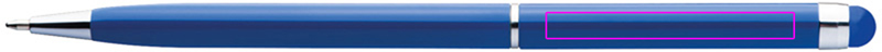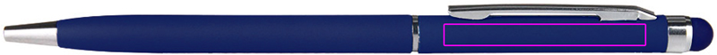 Nerūsējošā tērauda lodīšu pildspalva ar zilu plastmasas pildījumu un krāsai atbilstošu pieskāriena funkciju virs klipša. Mēs iegravēsim jūsu logotipu zem klipa.