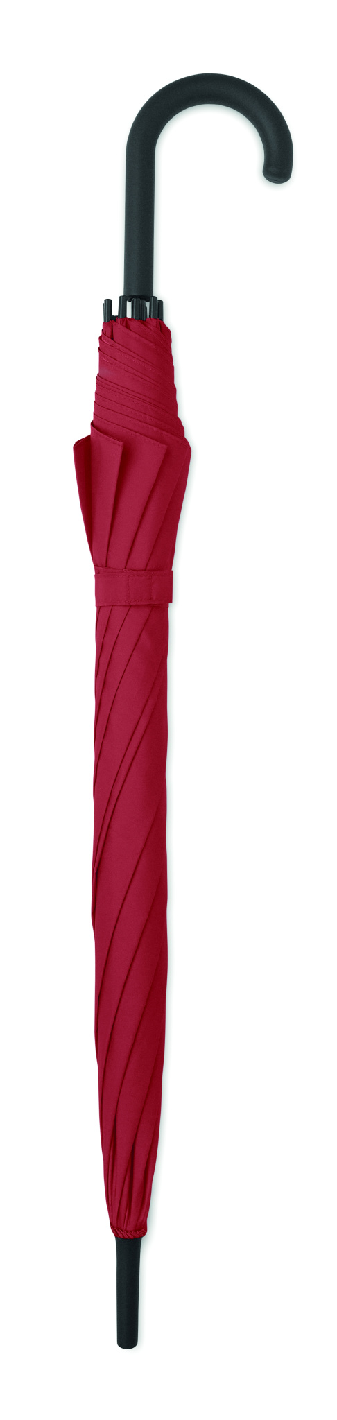 23 inch straight auto open windproof umbrella with full fibreglass frame and panels in 190T pongee fabric. Plastic tips and top. Rubberized PP plastic curved handle. Manual closure.
