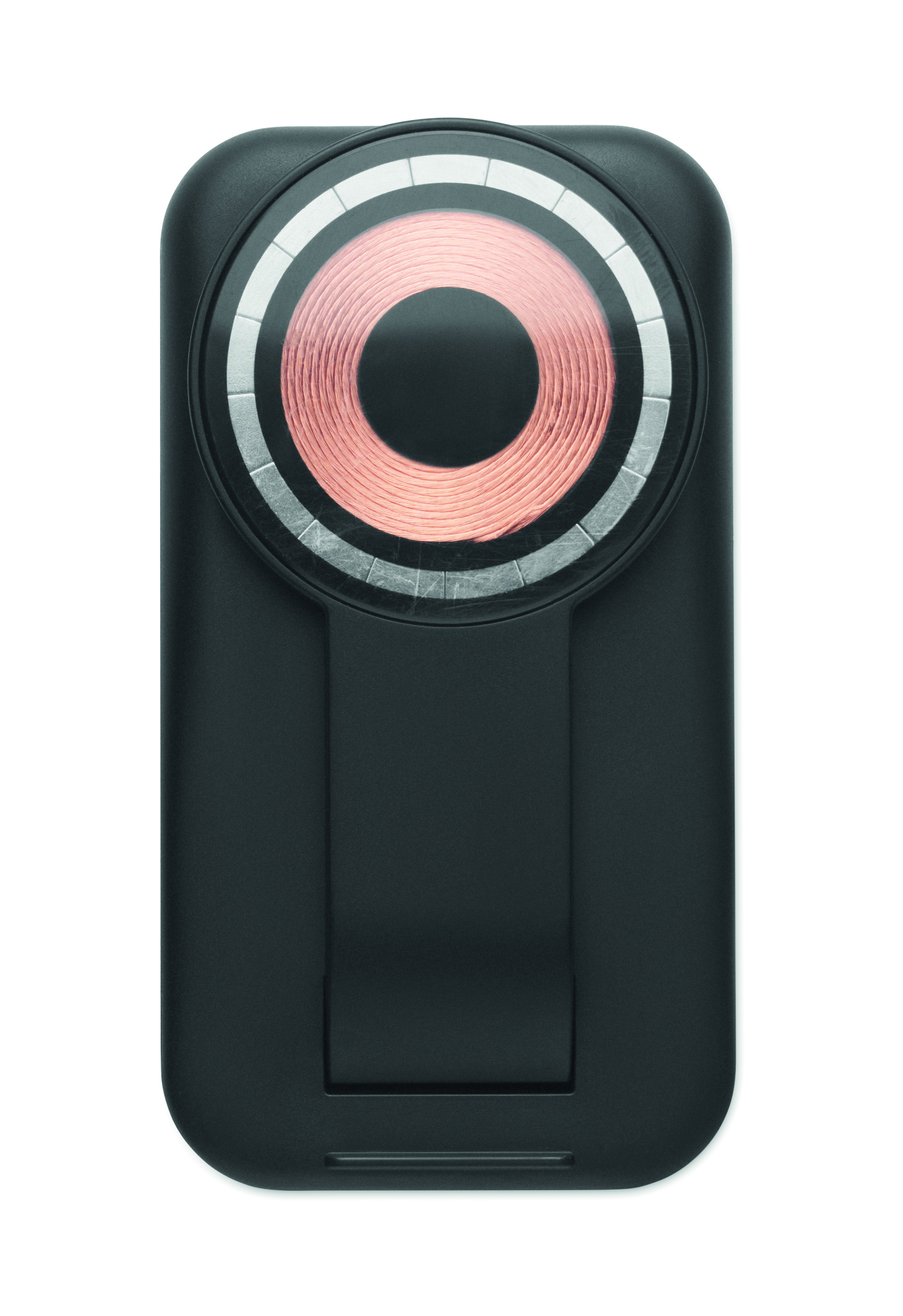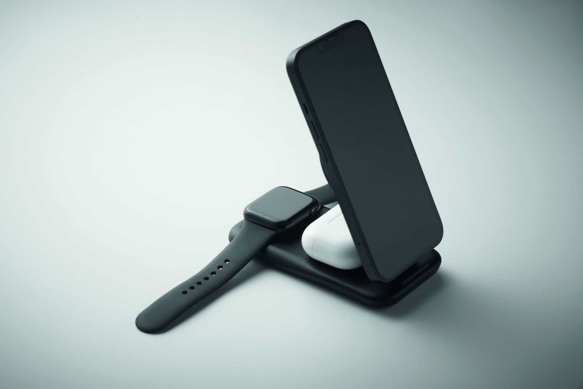 3 in 1 ABS charging station. Magnetic wireless charger 15W with phone stand, TWS charger and smartwatch charger (Apple® only). Compatible with iPhone® 12 and newer. With additional magnetic metal ring to support charging of non-magnetic wireless chargeable phones.