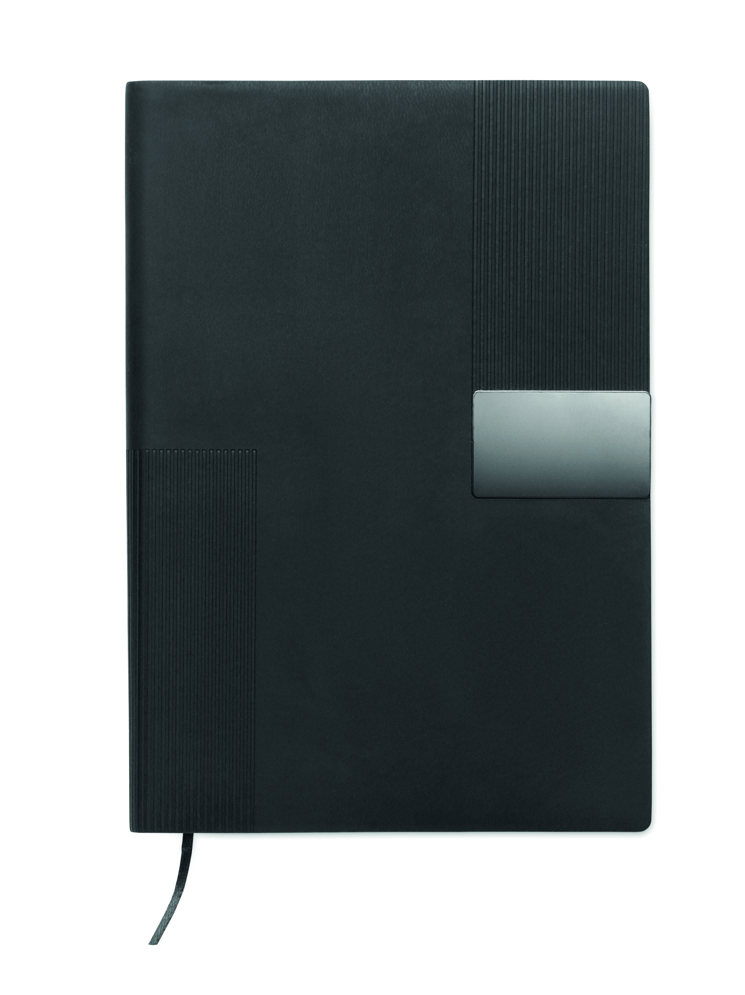 A5 PU notebook with soft cover. Casebound. 160 lined recycled paper pages (80 sheets). Matching elastic band and ribbon bookmark. Metal detail on the front.