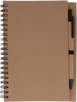Блокнот с картонной обложкой. Включает 70 страниц вторично переработанной бумаги и синюю шариковую ручку из биопластика.