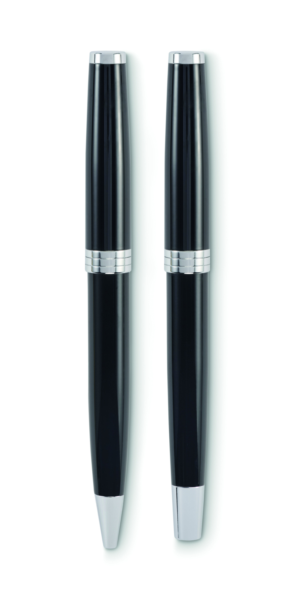 Set of twist ball pen and roller in recycled stainless steel barrel. Blue and black ink respectively. Presented in gift box.