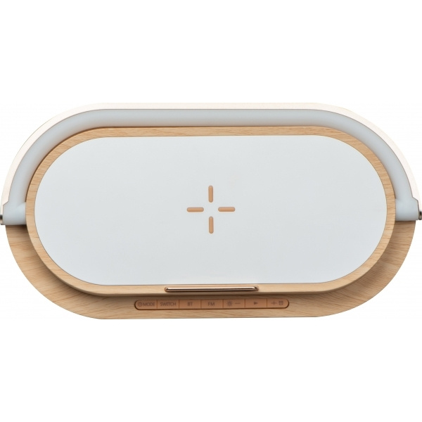 Bluetooth-колонка со встроенным индукционным зарядным устройством, цифровым дисплеем, аккумулятором емкостью 2000 мАч, радио, будильником, держателем для телефона и лампой с тремя уровнями яркости.