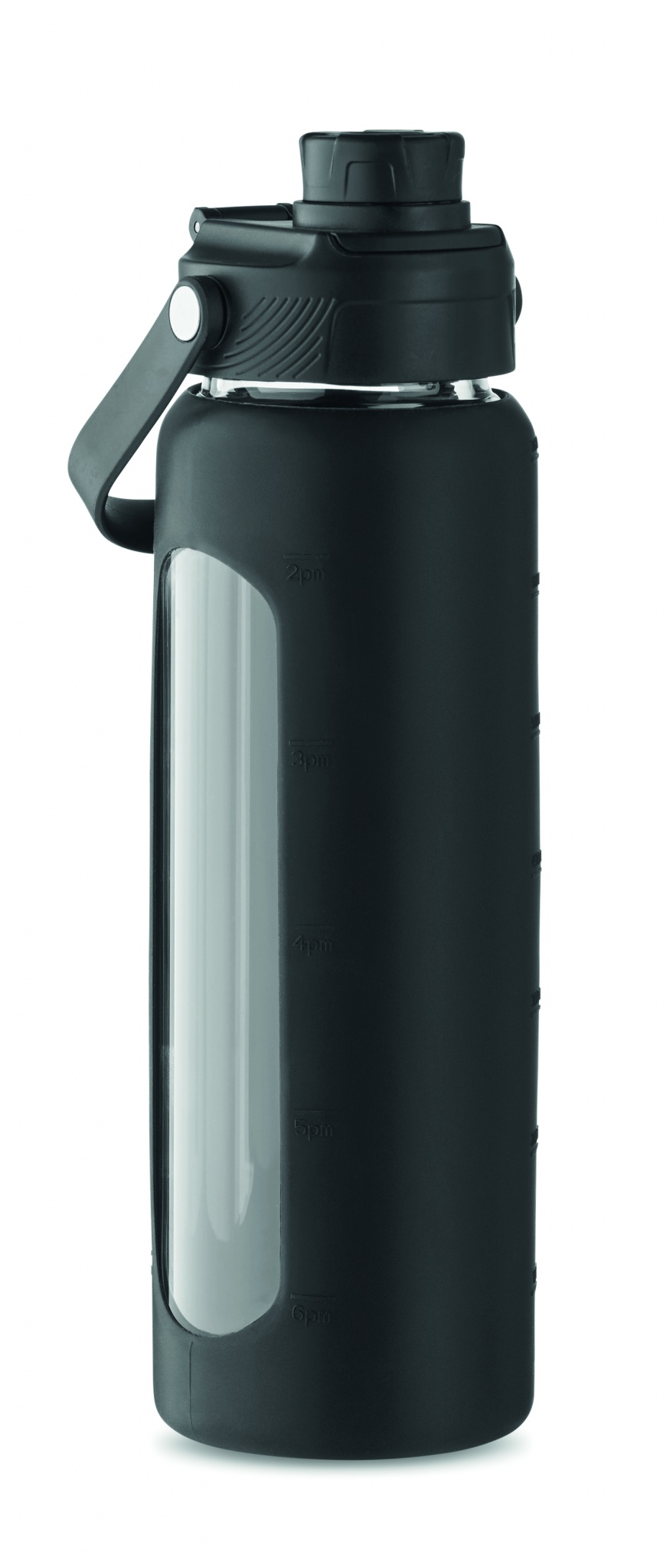 Бутылка из боросиликатного стекла с силиконовой прозрачной вставкой и полипропиленовой крышкой с ручкой для переноски. Герметична. Емкость: 750 мл.