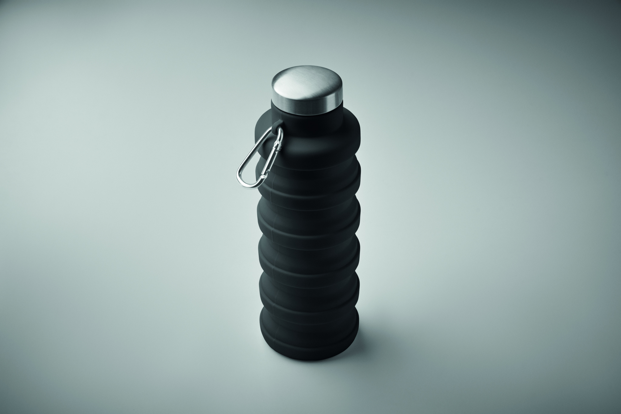 Collapsible silicone bottle with stainless steel lid and aluminium carabiner. The carabiner is not for climbing (non-professional use). Capacity: 500 ml.