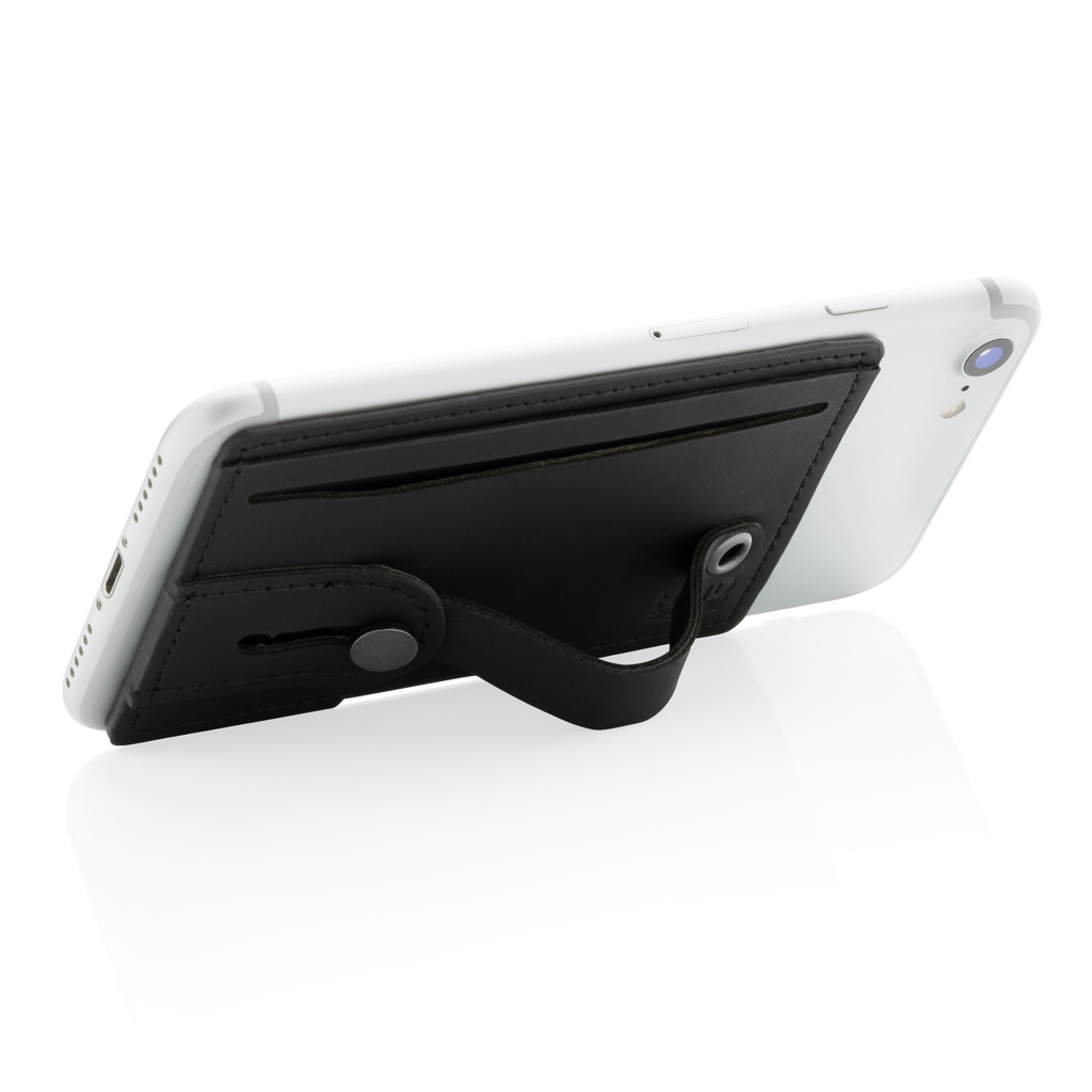 Кошелек для карт RFID из полиуретанового материала, который также можно использовать как держатель и подставку для телефона. Этот держатель для карт RFID может вместить до 2 банковских карт или удостоверений личности и защитит их от несанкционированного сканирования и мошеннических действий. Клейкая лента на задней стороне позволяет прикрепить держатель для карт к мобильному телефону с плоской поверхностью. Изделие имеет ремешок, который выполняет функции как держателя, так и подставки.