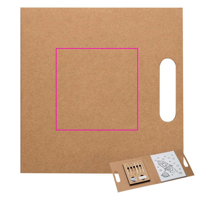 Папка-раскраска с переработанной обложкой, блоком красок (30 листов), держателем для переноски, точилкой, ластиком и мелками 6 разных цветов. Ваш логотип будет напечатан на обложке.