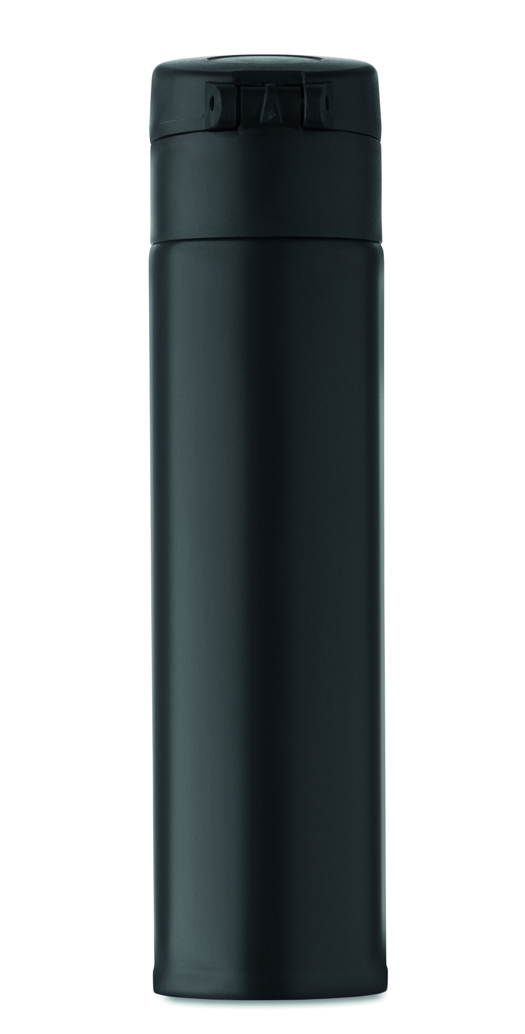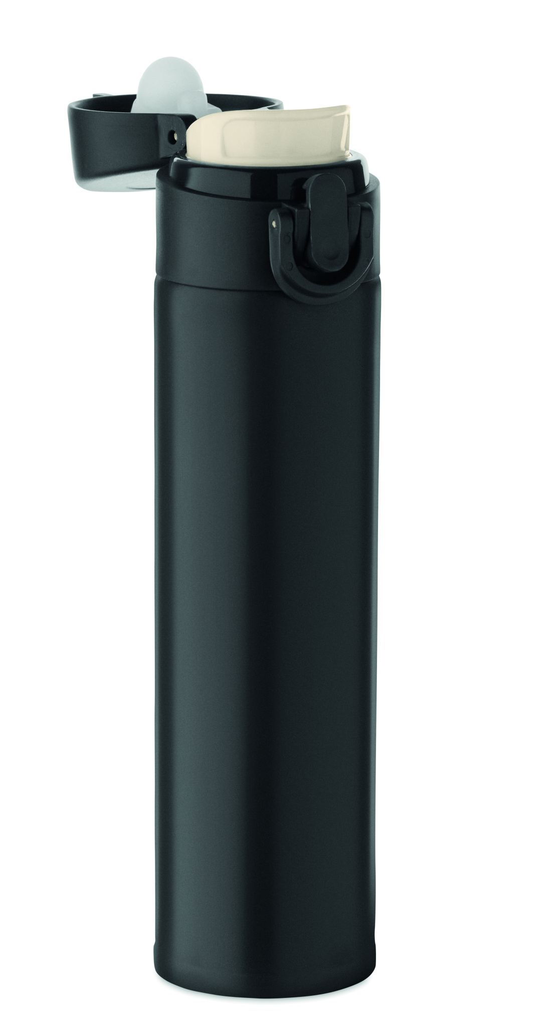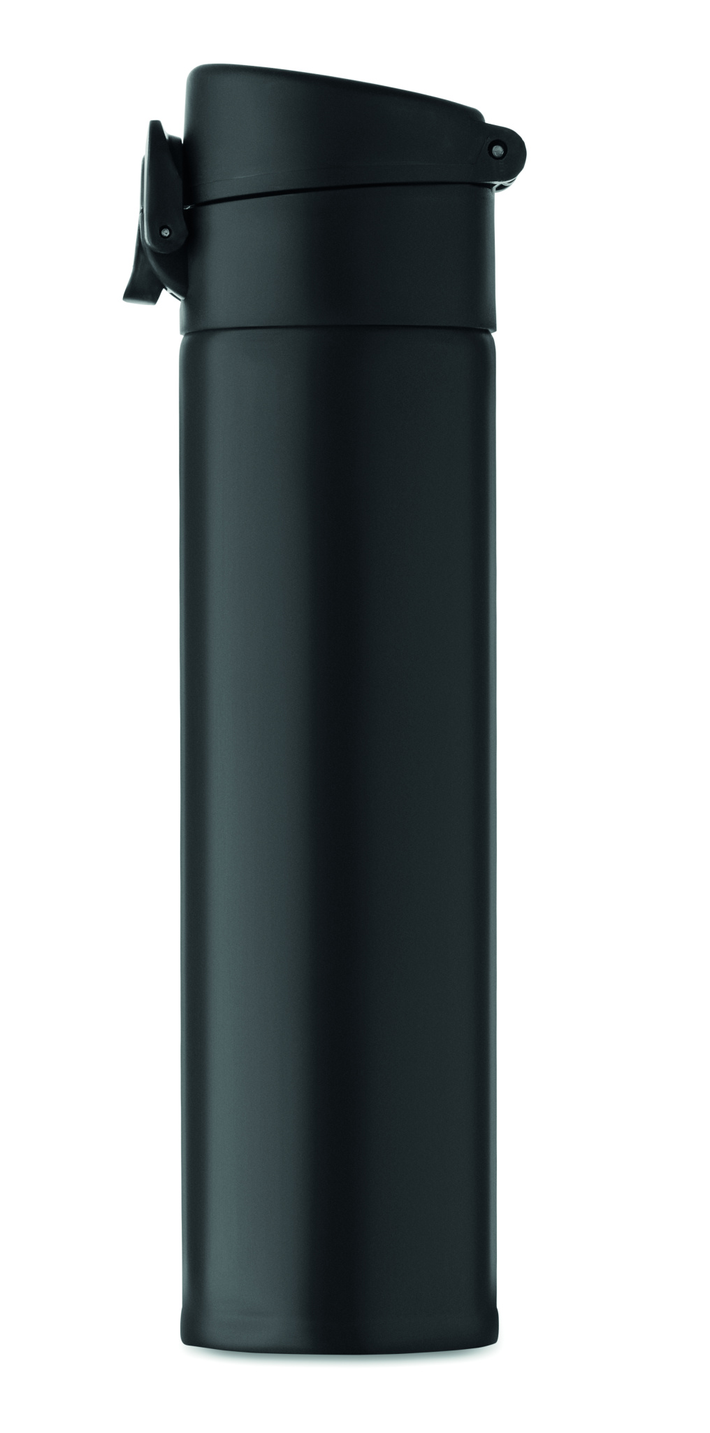 Double wall drinking bottle in recycled stainless steel (90% recycled stainless steel and 10% stainless steel) with security lock on the lid and press-to-open option. Leak free. Capacity: 300ml.