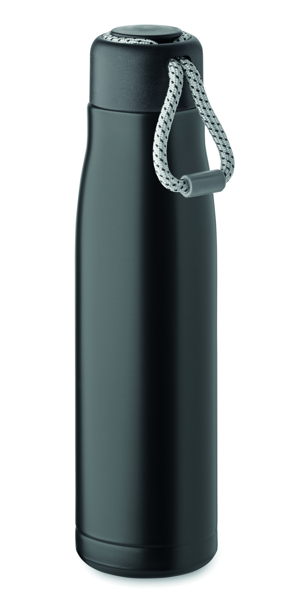 Double wall recycled stainless steel insulated vacuum bottle (90% recycled stainless steel and 10% stainless steel) with integrated cord grip on PP lid. Leak-free. Capacity: 500 ml.
