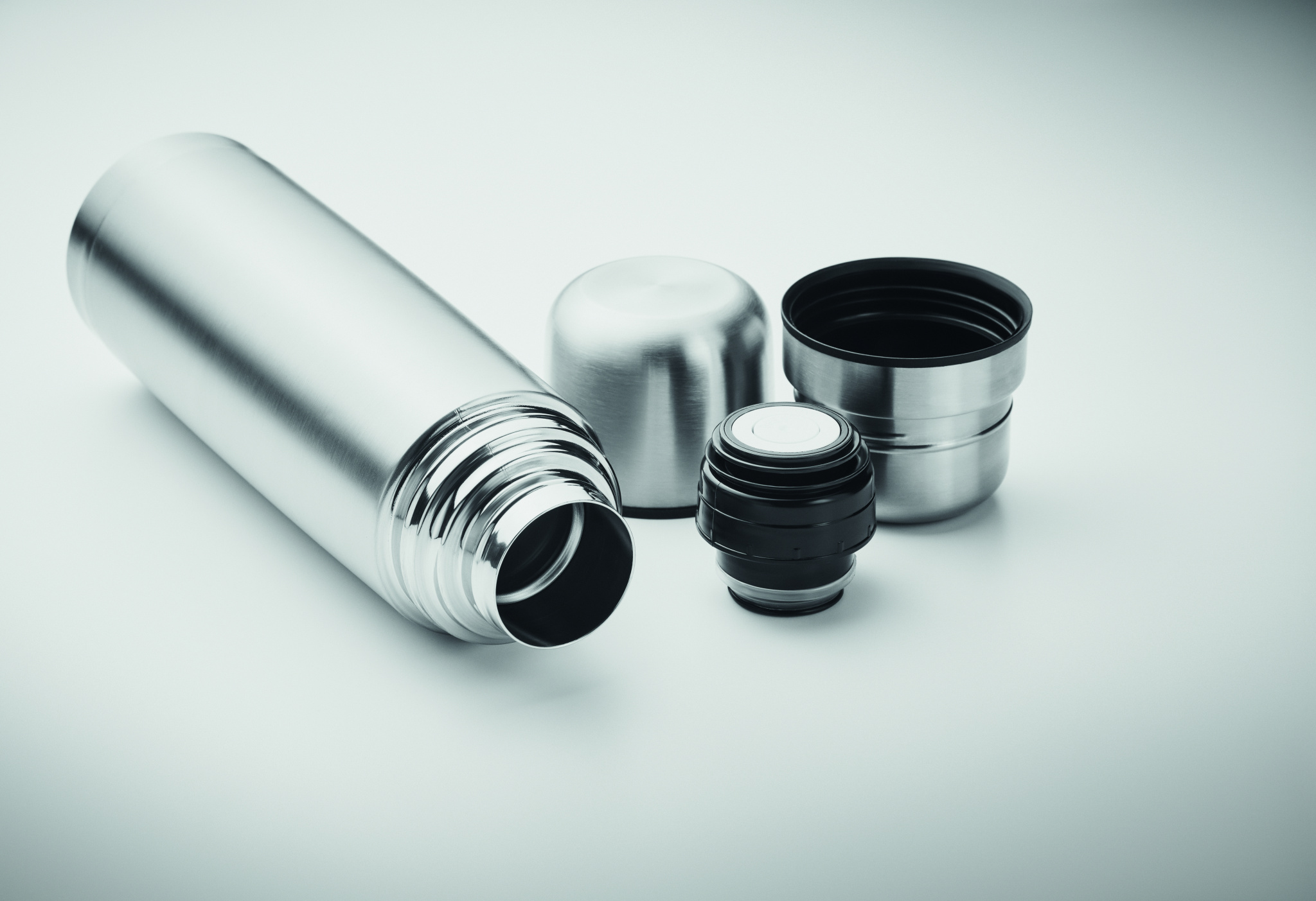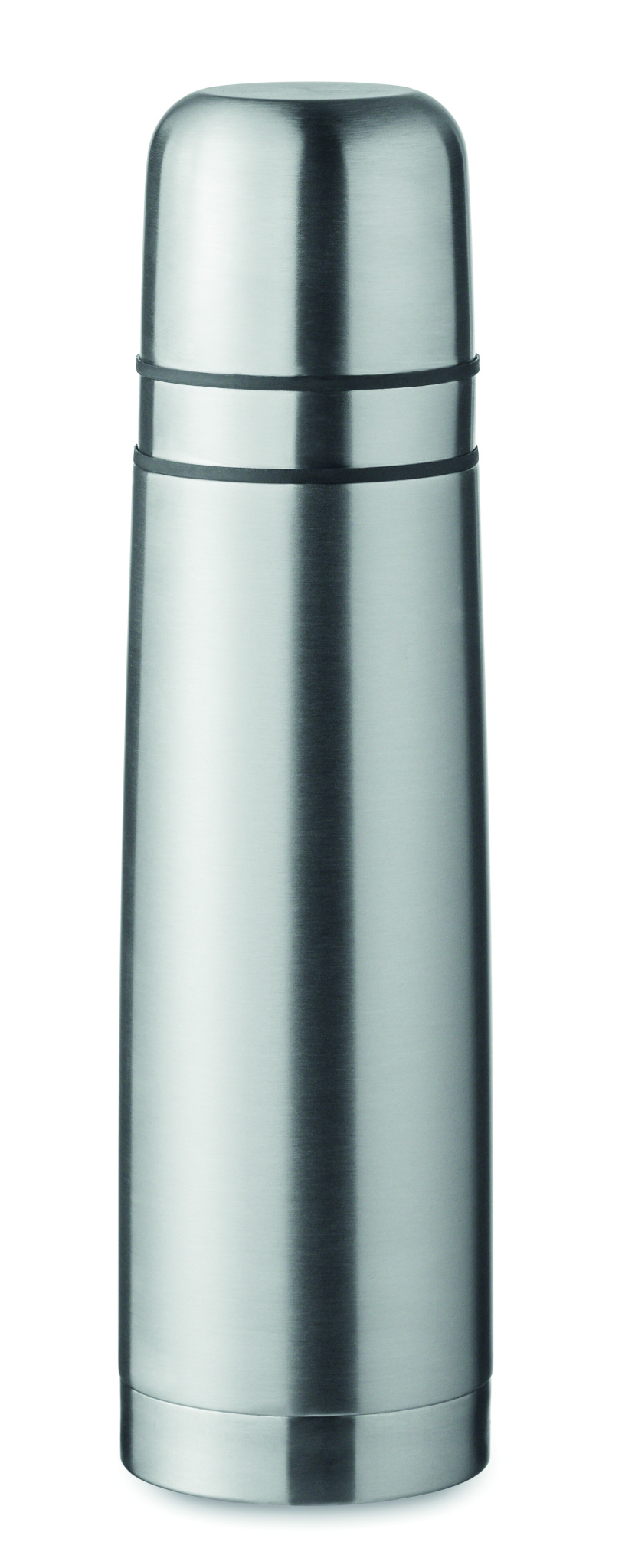Double wall recycled stainless steel (90% recycled stainless and 10% stainless steel) insulated vacuum flask with 2 integrated cups (inner wall PP) in lid. Capacity bottle: 750 ml, outer cup: 150ml, inner cup: 125ml.