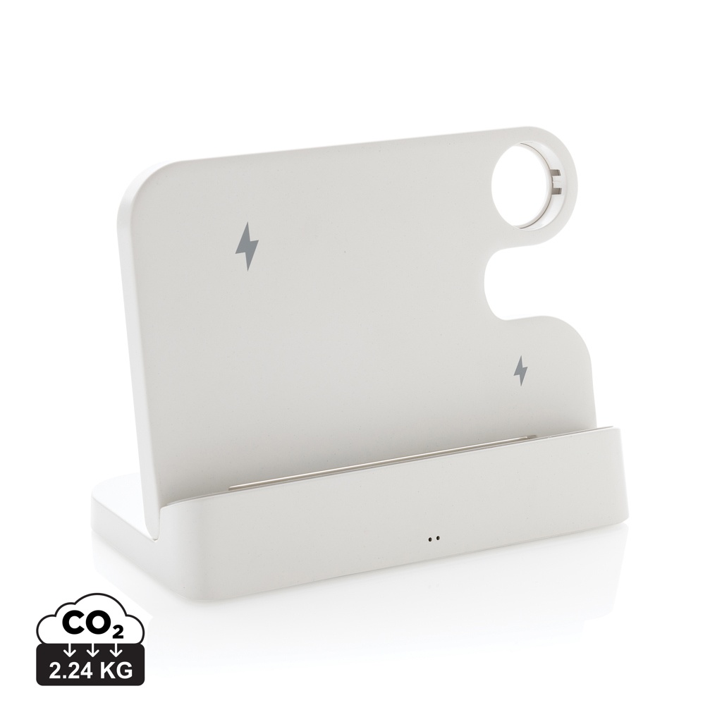 Складная подставка для зарядки с беспроводным зарядным устройством 15 Вт из переработанного АБС. Со вторым беспроводным зарядным устройством 5 Вт для зарядки небольших предметов, таких как наушники. С гнездом iWatch для установки официального зарядного кабеля для iWatch. На задней стороне есть выходной порт USB A и USB C 5 В/1 А для зарядки предметов с помощью кабеля. С силиконовыми наконечниками на дне, чтобы избежать скольжения, и силиконовой амортизацией подставки, чтобы ваш телефон оставался в идеальном состоянии. Общее количество переработанных материалов: 80 % от общего веса предмета. Сертификация RCS гарантирует полностью сертифицированную цепочку поставок переработанных материалов. Упаковано в упаковку FSC®. Не содержит ПВХ. Включает переработанный RCS TPE 120 см кабель для зарядки USB A - USB C. Упаковано в упаковку FSC®. Не содержит ПВХ
