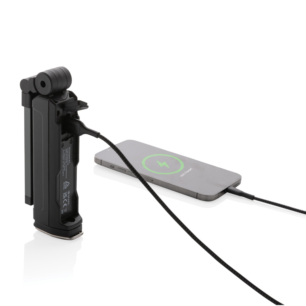 Функциональность и дизайн объединены в этом перезаряжаемом высокопроизводительном рабочем фонаре, изготовленном из сертифицированного RCS переработанного АБС-пластика. Общее содержание переработанных материалов: 25% от общего веса изделия. Сертификация RCS гарантирует полностью сертифицированную цепочку поставок переработанных материалов. В водонепроницаемом рабочем фонаре используется перезаряжаемая литиевая батарея класса А емкостью 2000 мАч, поэтому нет необходимости заменять батареи. Просто подзаряжайте через разъем USB и идущую в комплекте зарядную базу. Рабочий фонарь оснащен 600-люменовым COB-светильником и 200-люменовым светодиодным светом. С 4 режимами: светодиодный, COB, COB красный, COB аварийный мигающий. Фонарь можно полностью повернуть на 360 градусов. С магнитом и крючком внизу. С портом типа C для подзарядки и портом USB A для зарядки мобильных устройств. Время работы на одной зарядке: 3 часа.
