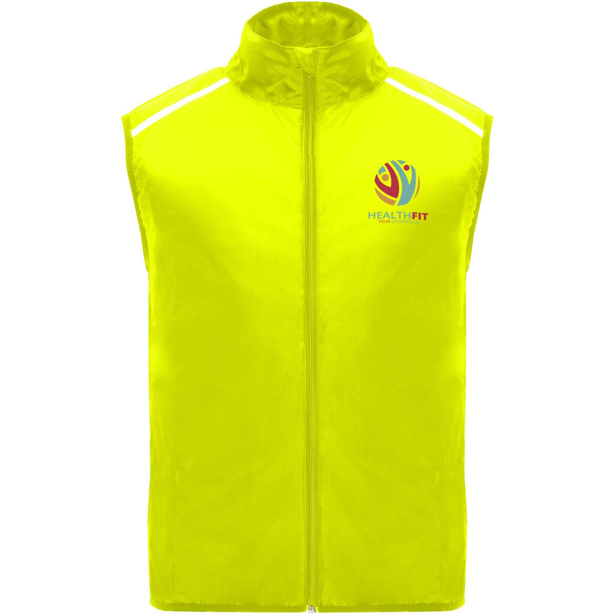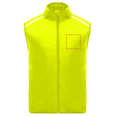 Ветрозащитный и дышащий. Передняя молния с защитой подбородка в тон. Эластичная окантовка в пройме и по низу. Нижняя часть спины из ткани с микроперфорацией. Яркие детали сверху, спереди и сзади. Карман с эластичным ремешком, позволяющий сложить жилет и носить его на запястье. Съемная этикетка.