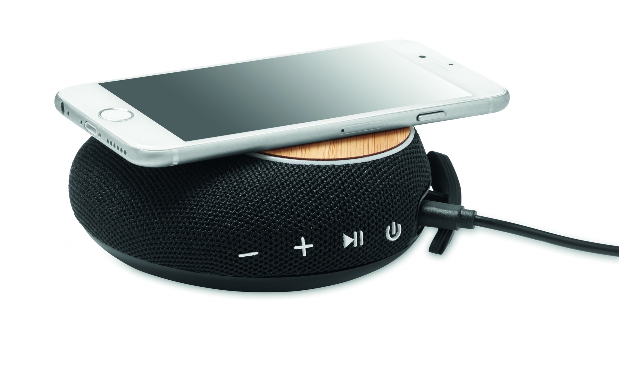 Беспроводная колонка 5.0 в пластиковом корпусе с бамбуковыми деталями. Также имеет встроенное беспроводное зарядное устройство мощностью 10 Вт и аккумулятор емкостью 4000 мАч. Встроенный аккумулятор емкостью 1800 мАч. Выход DC 9V/1.1A.