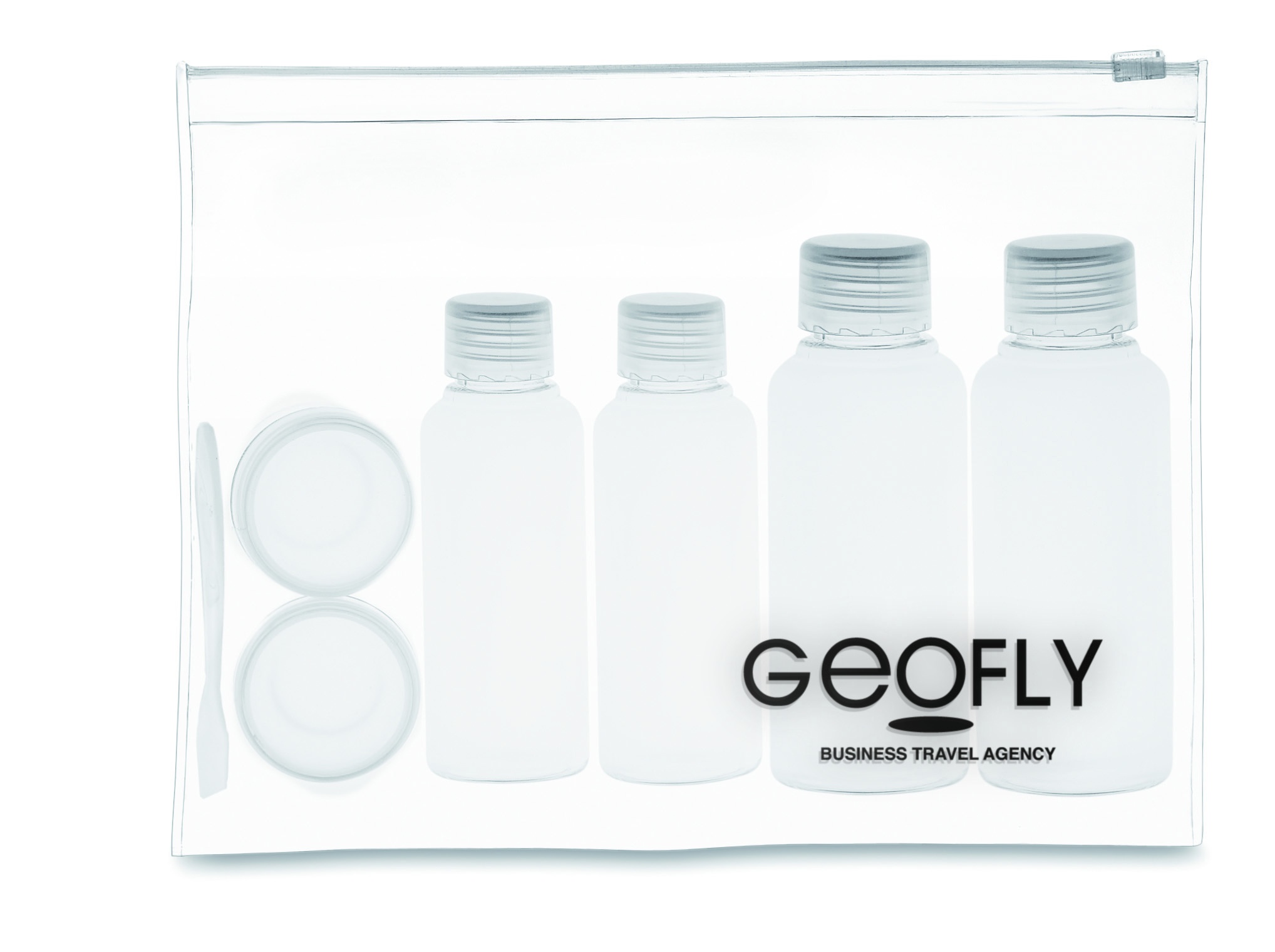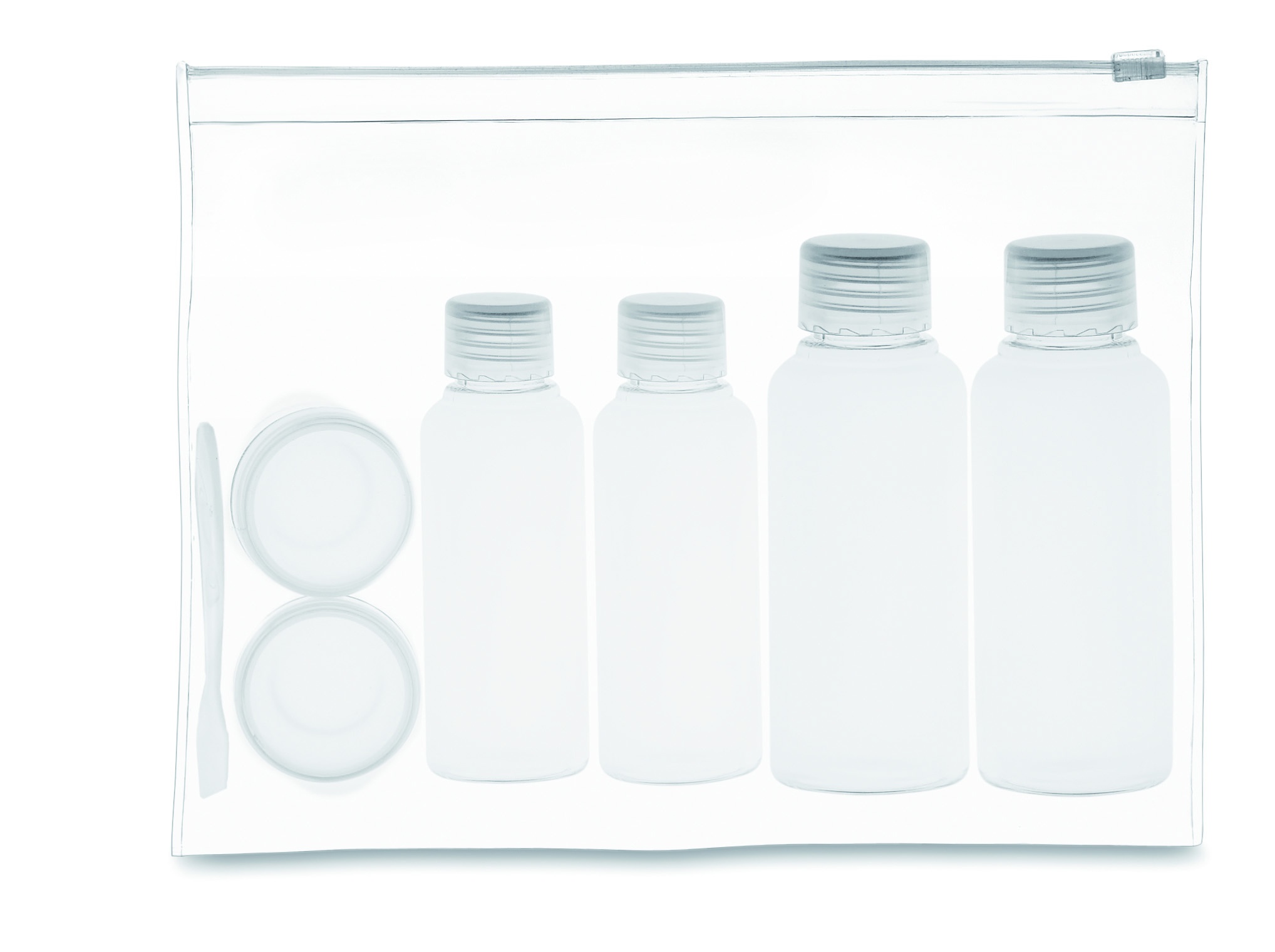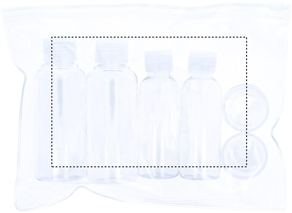 Прозрачная дорожная косметичка с 6 пластиковыми пузырьками для косметических средств. Очень удобно для часто путешествующих. (100ml, 50ml and 10ml)