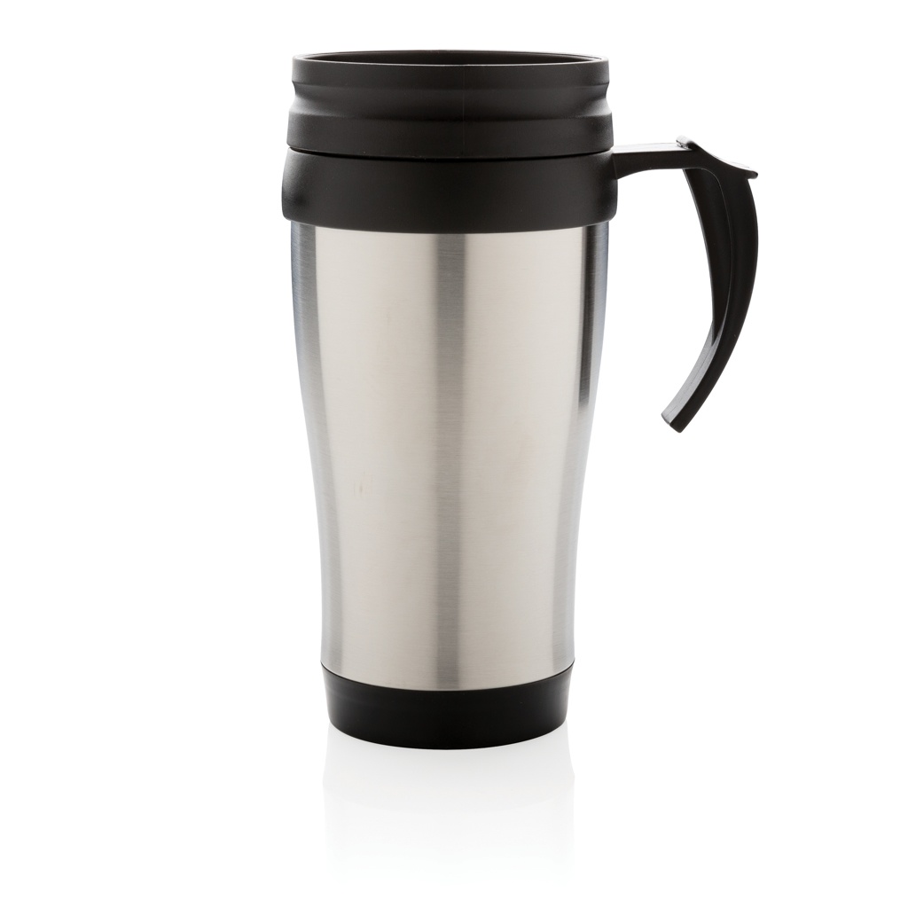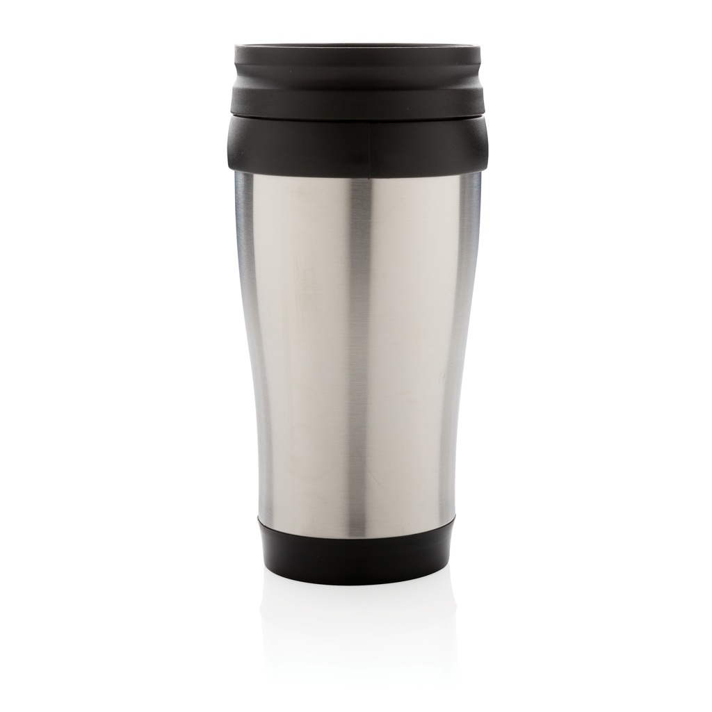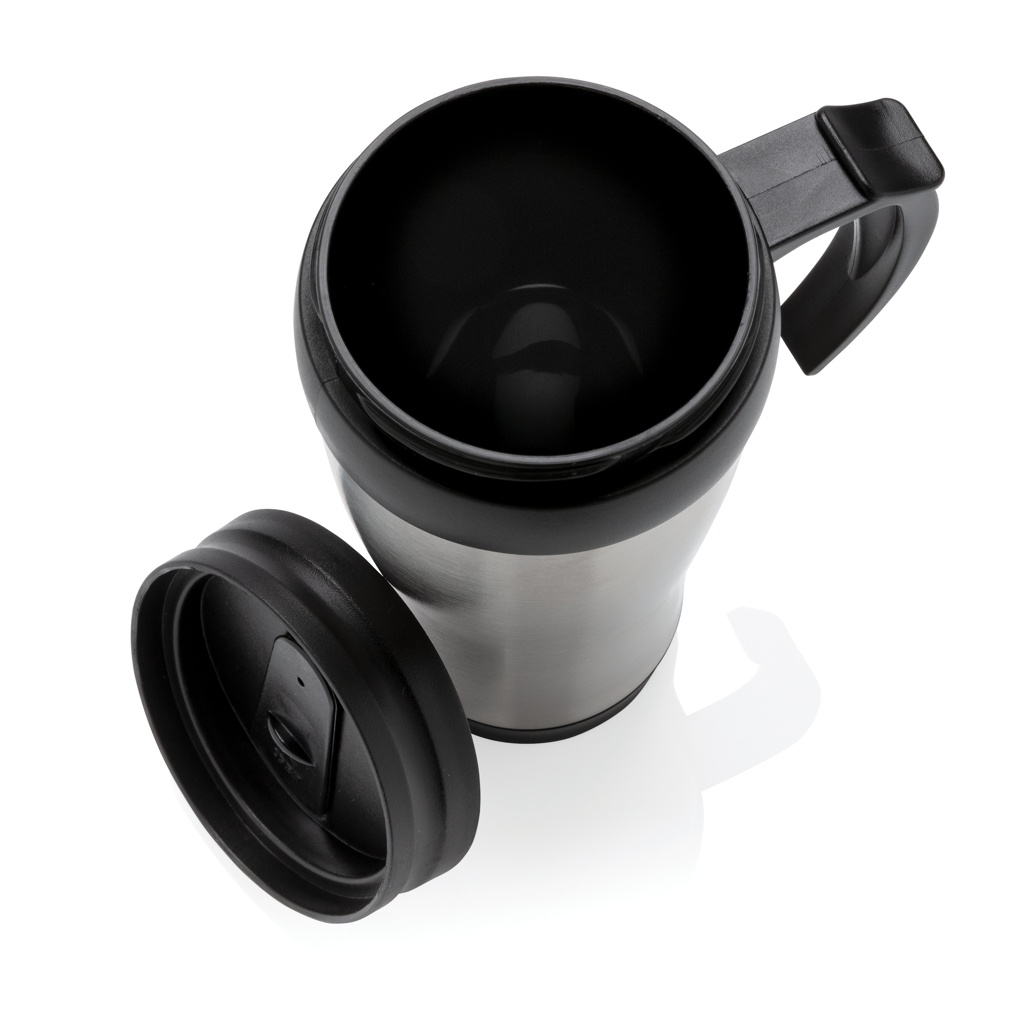 Кружка объемом 350 мл из нержавеющей стали снаружи и полипропилена внутри с крышкой и основанием черного цвета.
