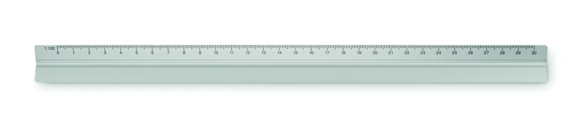 Треугольная алюминиевая линейка 30 см. Имеет 3 стороны и 5 различных шкал измерения.