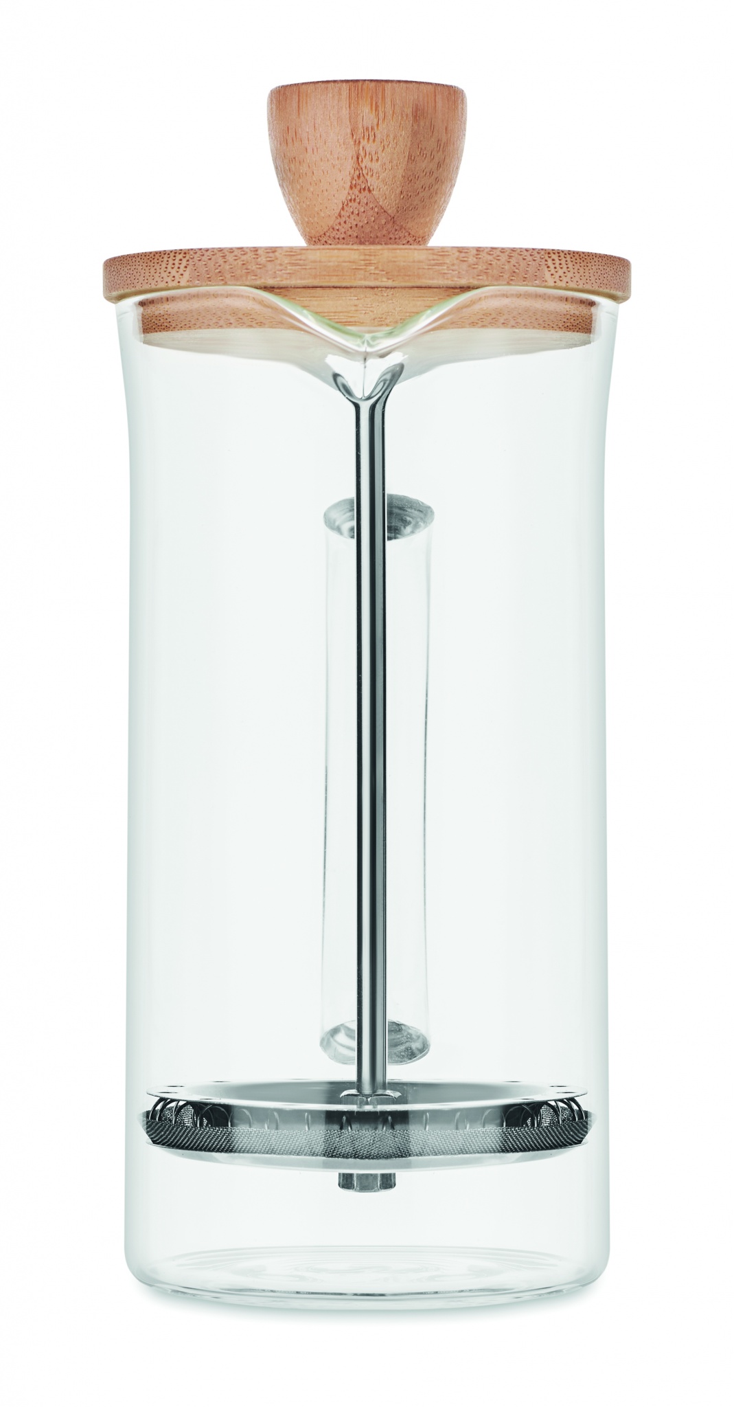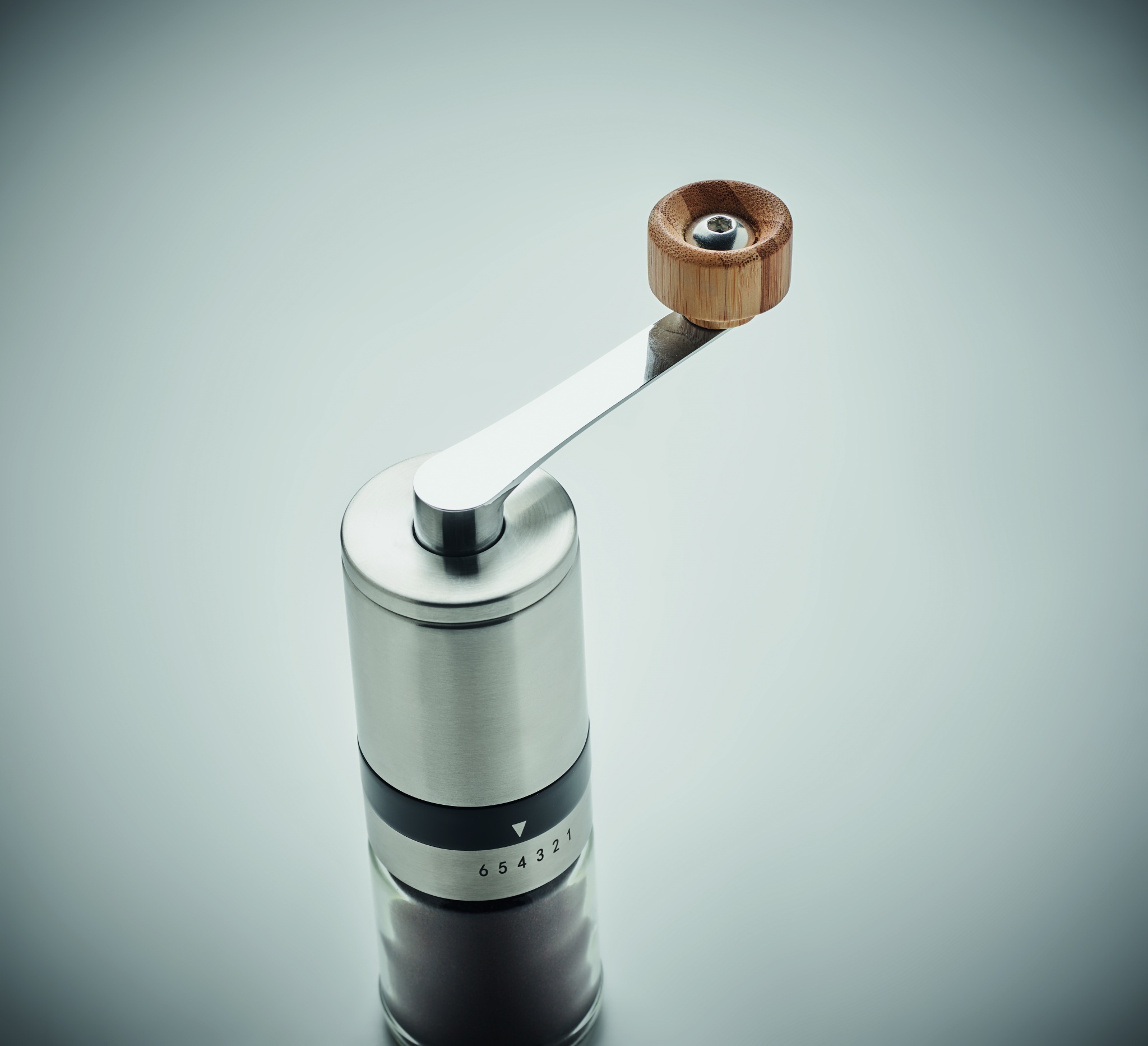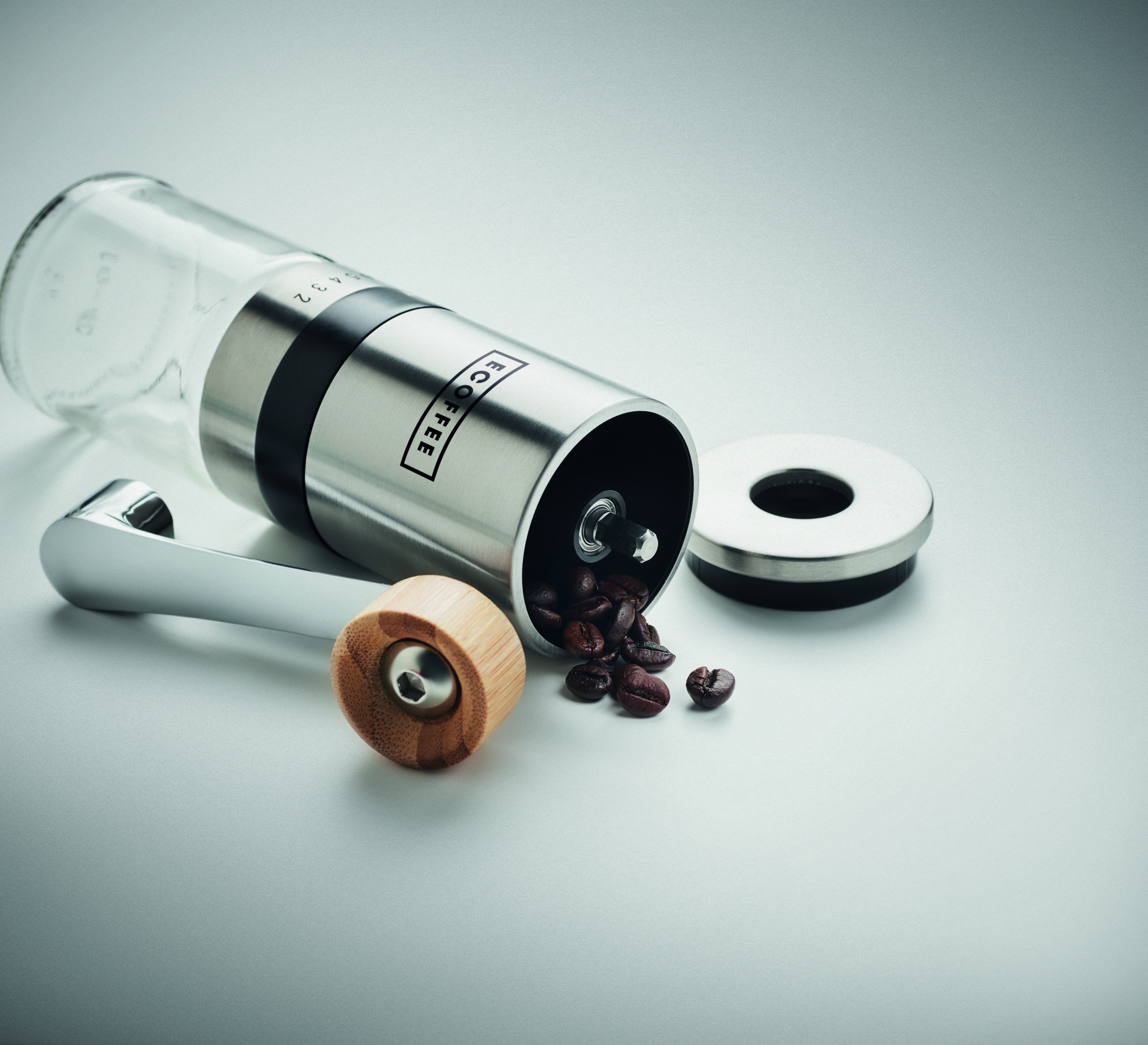 Кофейный набор. Включает кофейник из стекла и нержавеющей стали и ручную керамическую кофемолку с бамбуковой отделкой. Объем: кофейник 350 мл, кофемолка 100 мл.