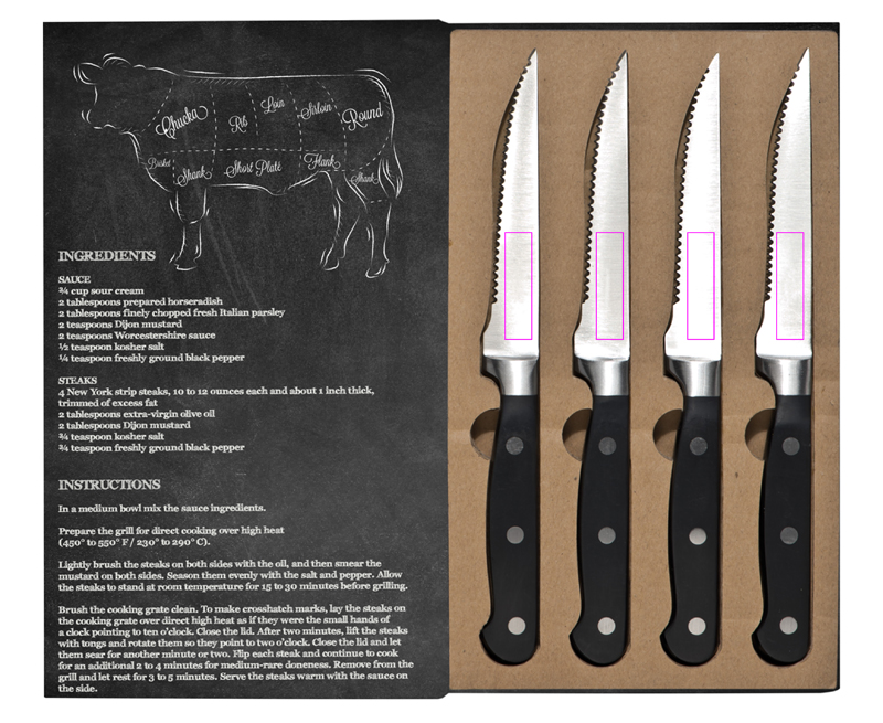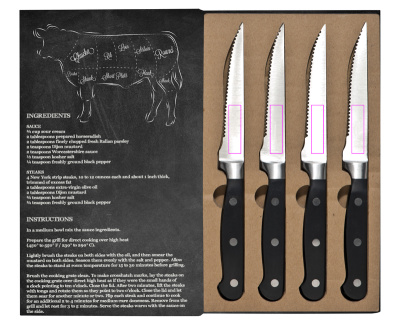 История мяса! Для идеального стейка вам нужны идеальные ножи, иначе ваш стейк будет выглядеть более или менее как фарш. Этот набор ножей для стейка изготовлен из нержавеющей стали, а качество просто потрясающее. Упаковка сделает набор еще лучше. Мы нанесем ваш логотип на упаковку методом тампопечати.