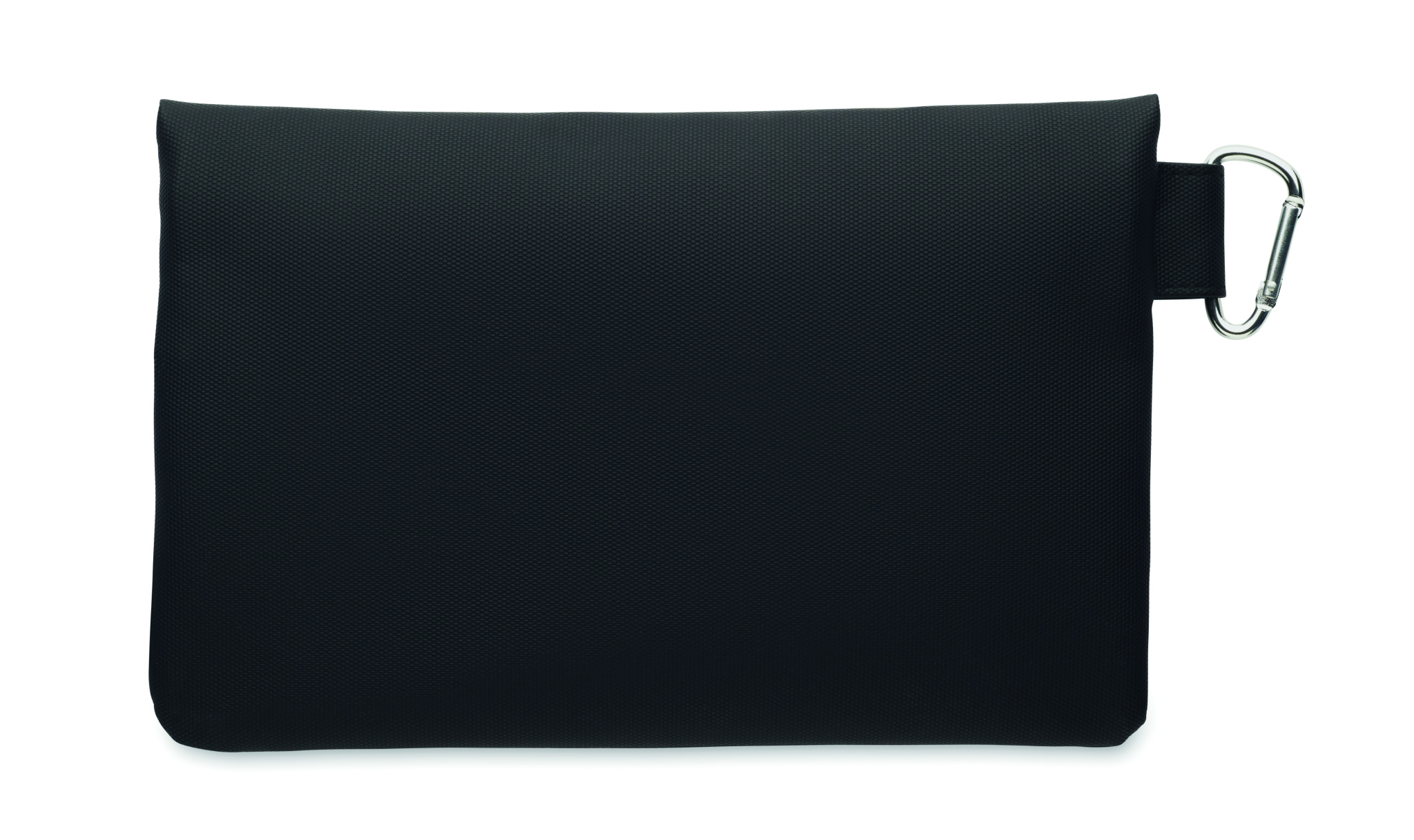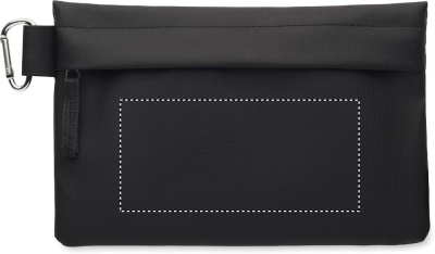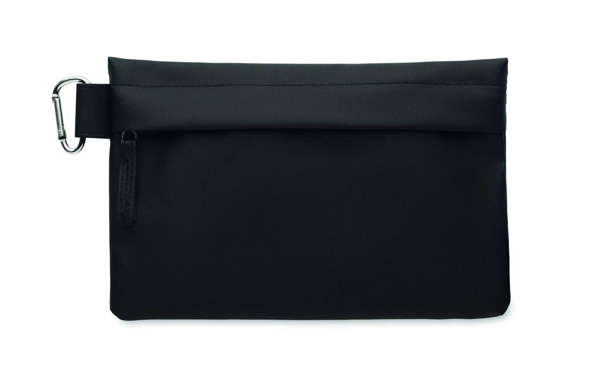 Portable organizer / pouch with PU coated 600D RPET polyester and zippered closure.