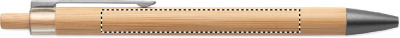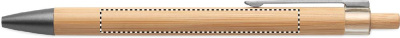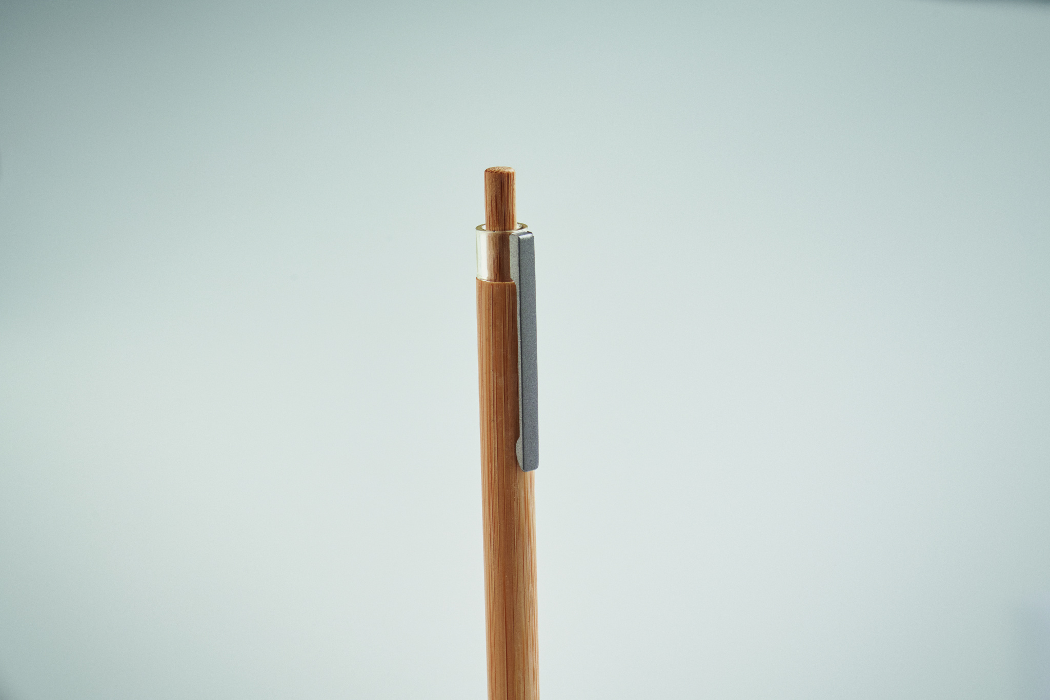 Push button pen with bamboo barrel and metal clip. Blue ink.