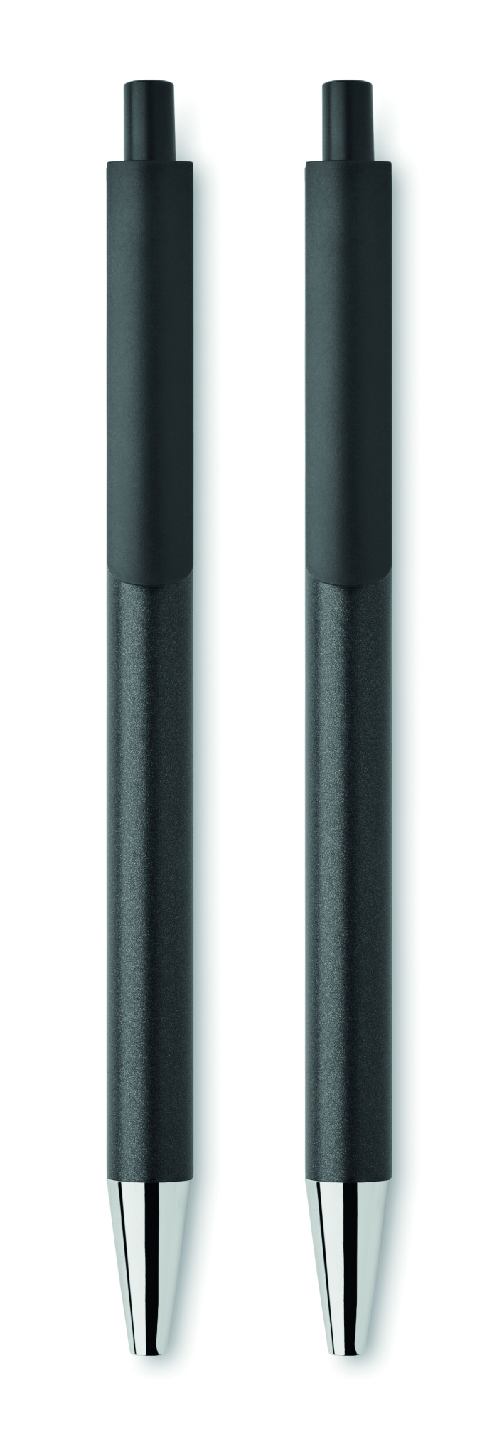 Recycled aluminium pen set with 1 push button ball pen and 1 graphite inkless pen. Blue ink. Presented in recycled paper box.