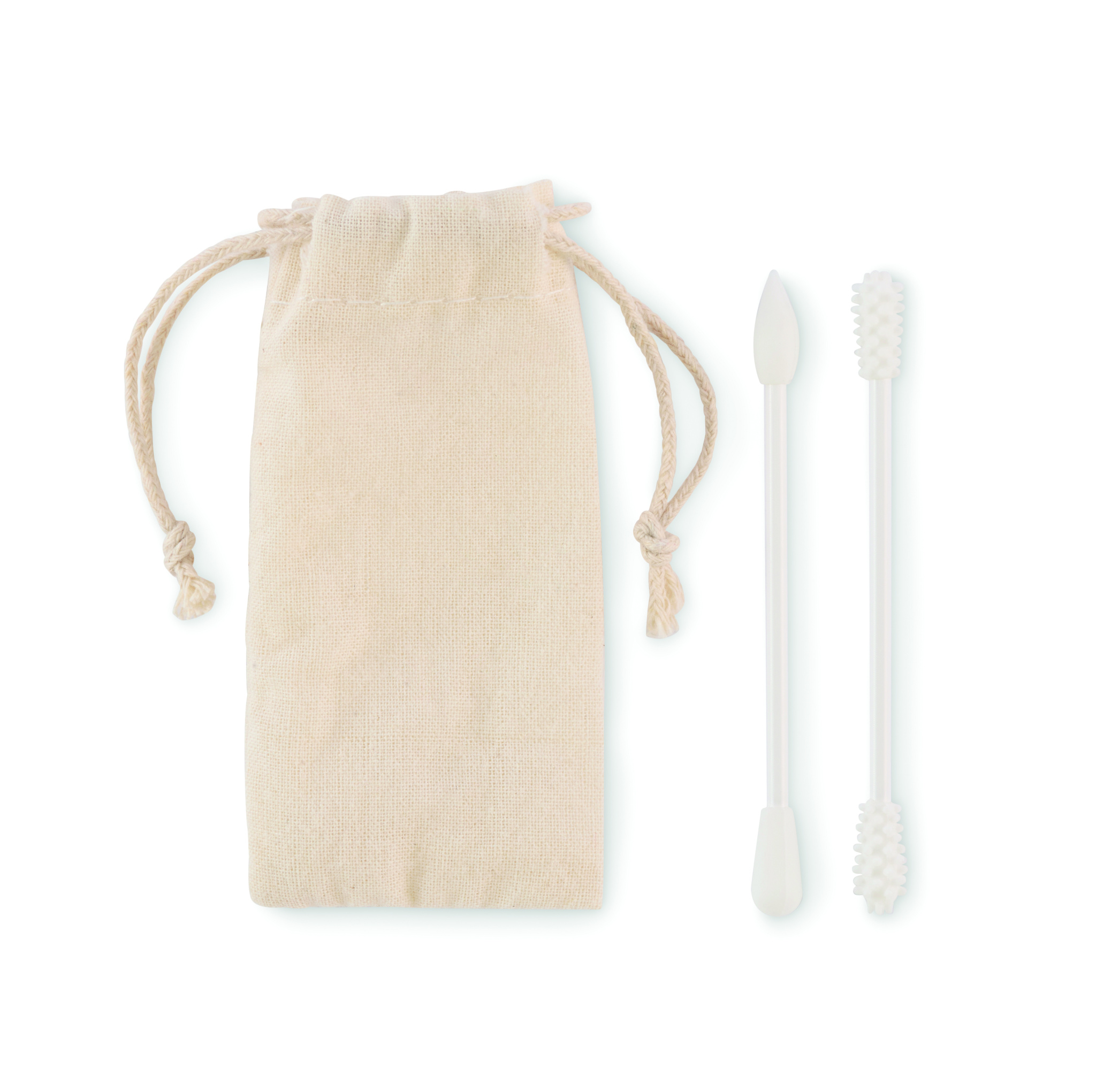 Set of 2 reusable and washable silicone swabs with 3 different heads. Presented in drawcord cotton pouch.